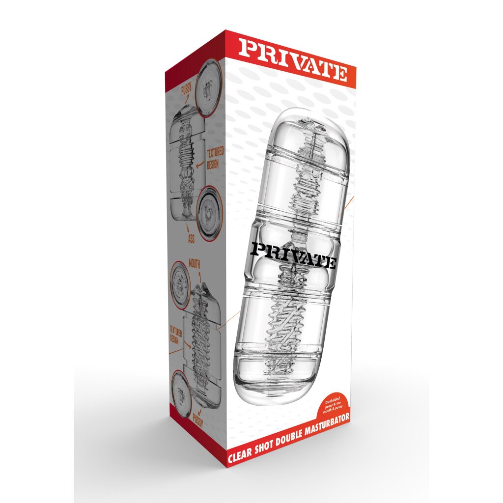 Ultimate visual pleasure: The clear dual-sided masturbator in a hard case. Experience unrivalled pleasure with the Clear Dual-Sided Masturbator from PRIVATE. This innovative masturbator combines tantalising sensations and immersive images in a slim, transparent case. Watch your arousal unfold stroke by stroke thanks to the crystal clear design that allows an unobstructed view of your most intimate moments. It's like enjoying your favourite PRIVAT movies in real time. With great attention to detail, the Dual-Sided Masturbator Sleeve offers three tantalising options: a realistic pussy, a tight ass and a juicy mouth side.