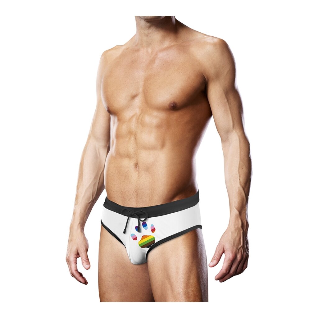 Le point fort de ce slip de bain est sans aucun doute le logo de la patte de Prowler, conçu dans le style du drapeau coloré de la LGBTQ Progress Pride.