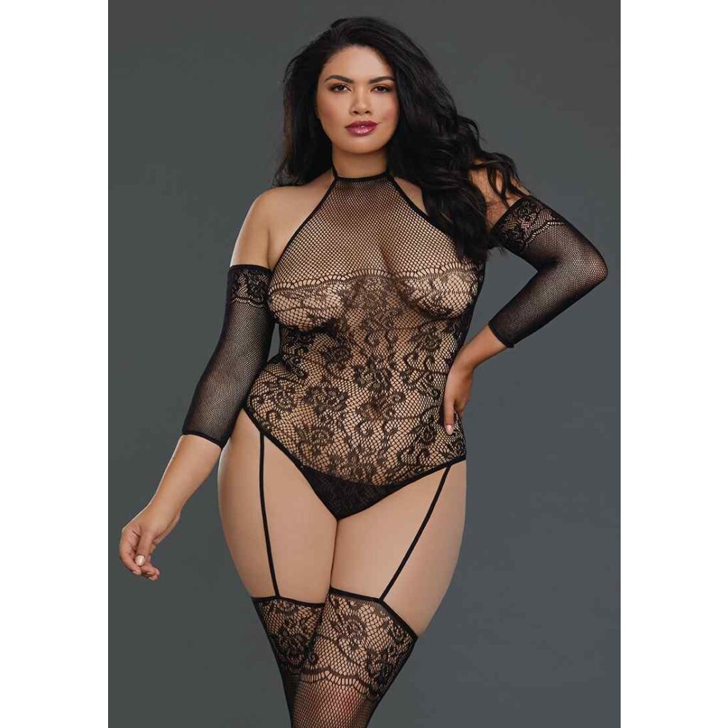 Queen Size Body mit hohem Halsausschnitt aus gestrickter floraler Spitze und Netzstrümpfen mit offenen Schultern und 3/4 langen Ärmeln. Der Body hat angesetzte Strümpfe. Elegant, aber sehr sexy Design. Hergestellt aus 90% Polyester und 10% Elasthan. Nur für Handwäsche geeignet, zum Trocknen aufhängen.