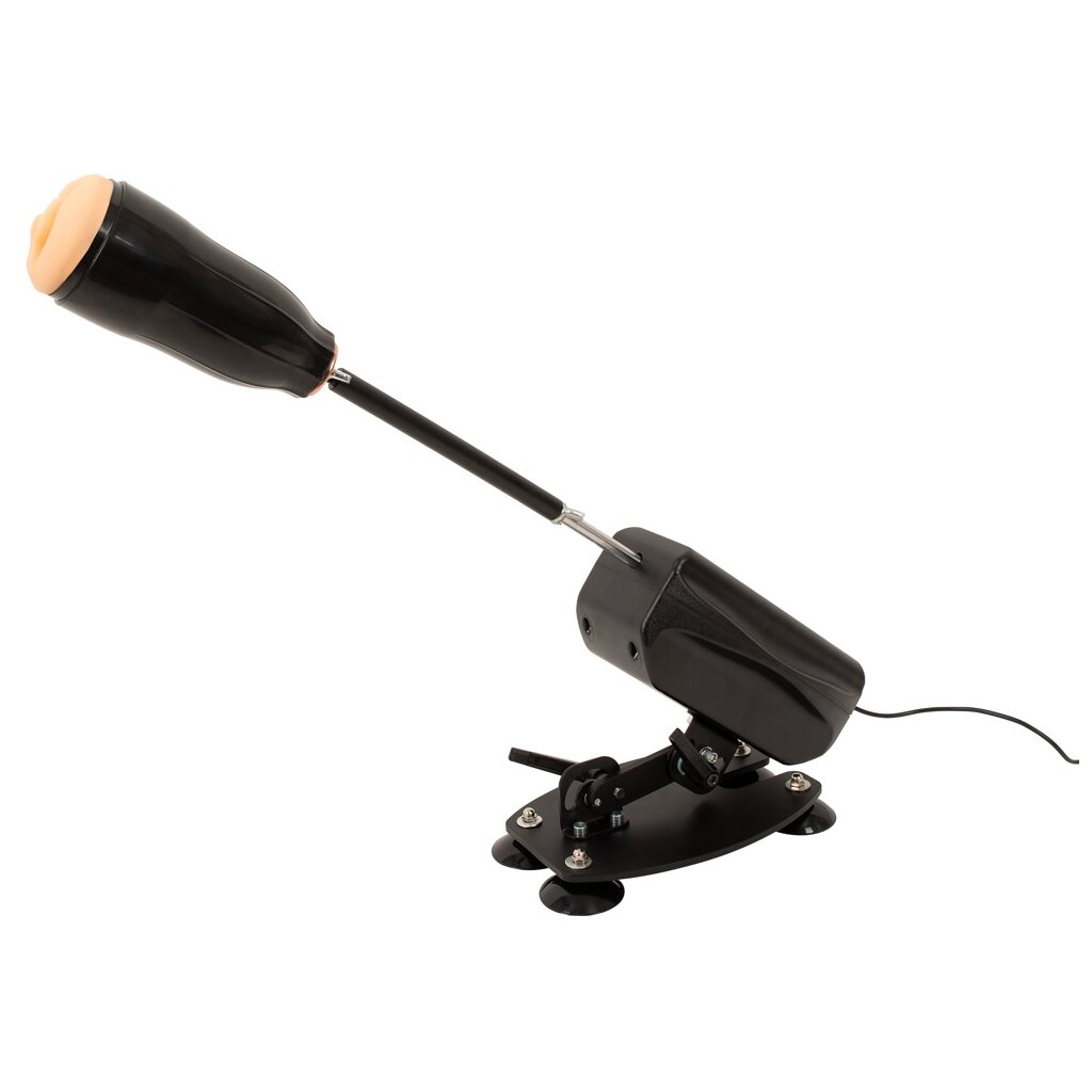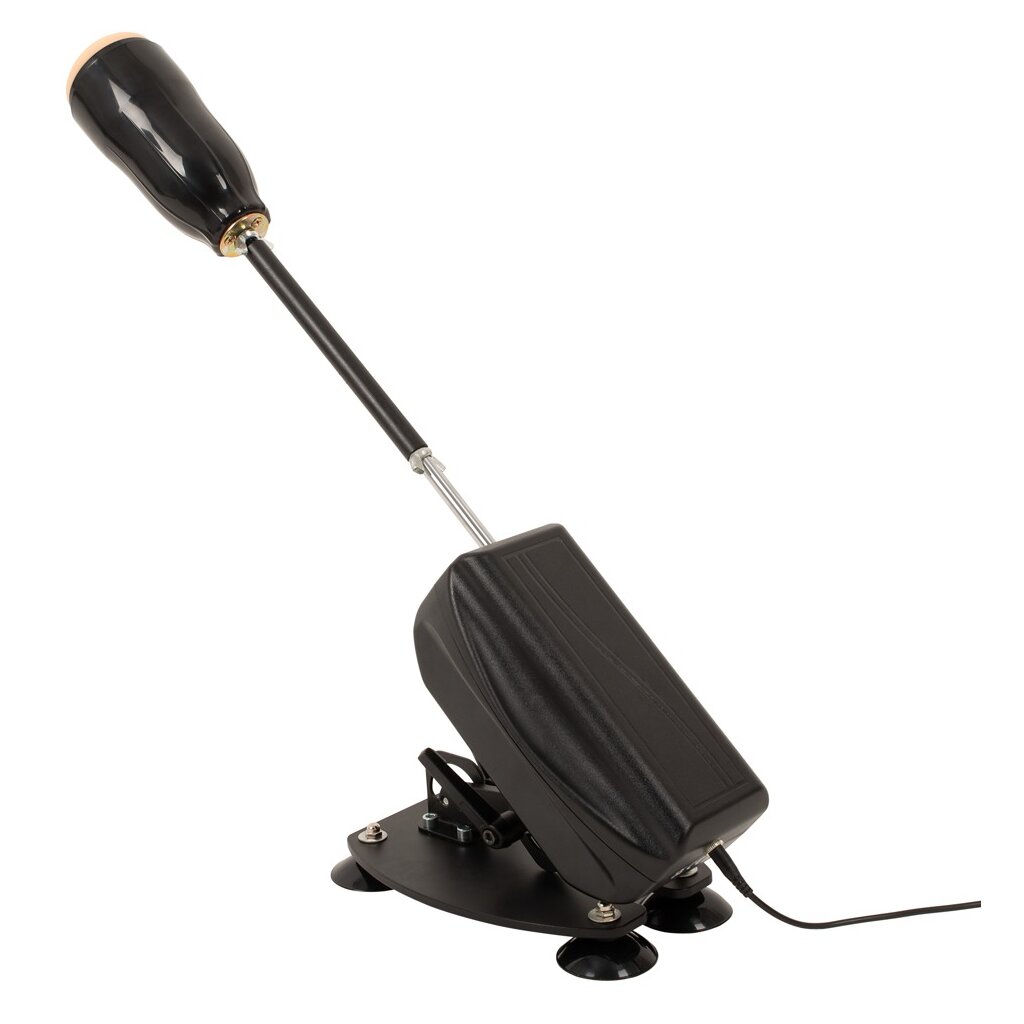 Machine sexuelle (22 cm x 15 cm x 17 cm), tige de 12 cm de long, tige d'extension de 20 cm de long. Cordon d'alimentation avec adaptateur de 280 cm de long. Métal, ABS, PVC, TPE.