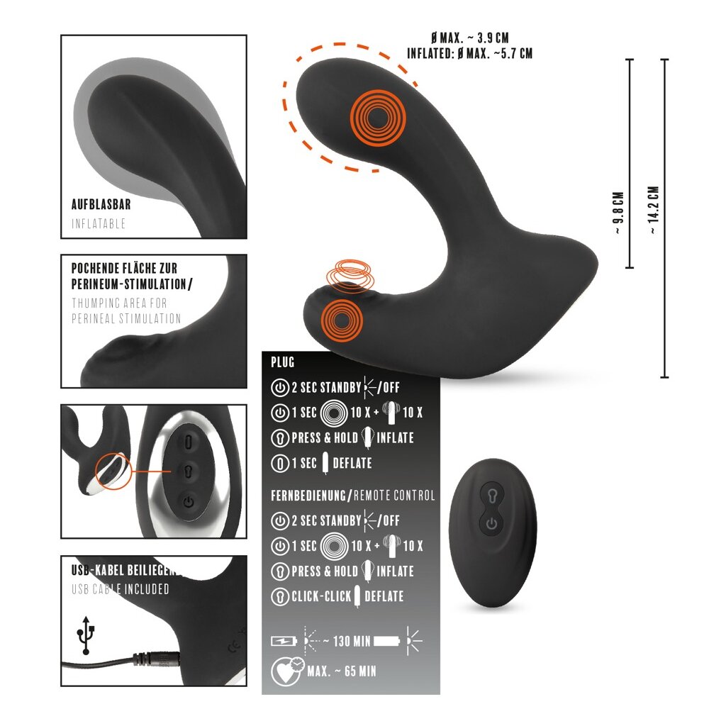 The plug can be easily inflated with the push of a button - for a wonderfully filled feeling and a perfect anal stretching workout. With the practical remote control, the 10 varied vibration and pulsating tapping modes, as well as the air pressure release function can also be conveniently controlled at the touch of a button. With a range of up to 8 meters also from the partner.