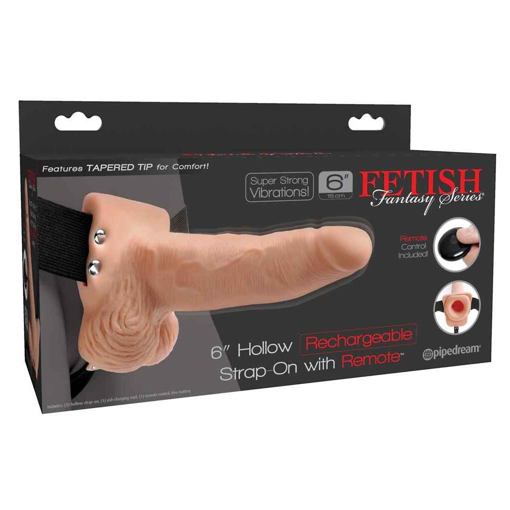 Realistic, hollow strap-on dildo with stretchy straps and 10 vibration modes. The bulging guy stands out with its realistic details and because it's completely life-like. It can be worn by men and women. Includes a remote control and it can be recharged with the included USB cable.