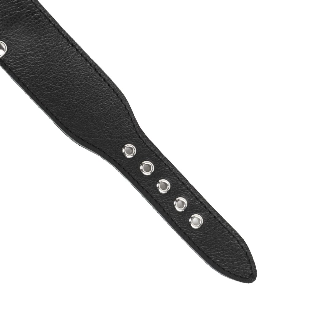 La boucle métallique située à l’arrière permet un ajustement précis et un maintien sûr. L’association du cuir noir, de la doublure douce et des finitions métalliques brillantes confère à ce collier une esthétique raffinée et dominatrice.