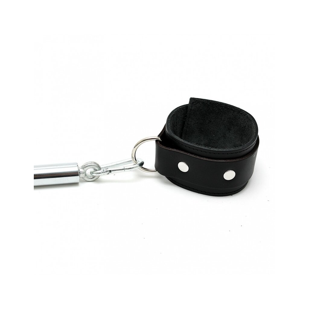 Die 5 cm breiten Fußfesseln aus echtem Sattelleder schmiegen sich angenehm an die Haut, bieten gleichzeitig festen Halt und lassen sich über stabile Metallschnallen anpassen. Durch die seitlichen Karabinerhaken können sie leicht von der Stange gelöst oder separat verwendet werden. Die Kombination aus glänzendem Metall und geschmeidigem Leder verleiht diesem Toy eine elegante, dominante Ausstrahlung – ideal für anspruchsvolle Bondage-Liebhaber, die Flexibilität, Kontrolle und Stil zu schätzen wissen.