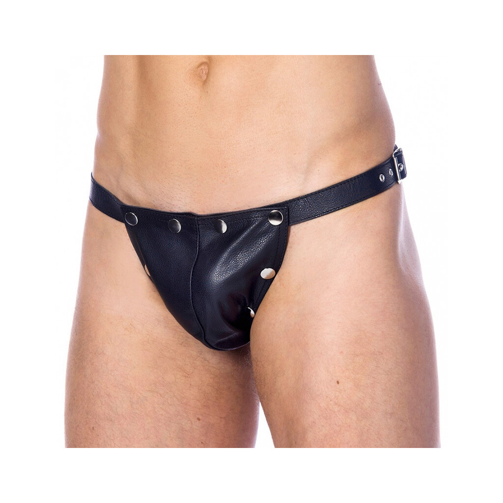 Das Vorderteil aus feinem, schwarzem Nappaleder ist mit robusten Druckknöpfen befestigt und lässt sich mit einem Handgriff abnehmen – für spontane Lust und direkte Zugänglichkeit. Der breite Gürtel mit seitlicher Metallschnalle sorgt für festen Halt, während die elastischen Riemen hinten dein Gesäß freilegen und perfekt umrahmen.
