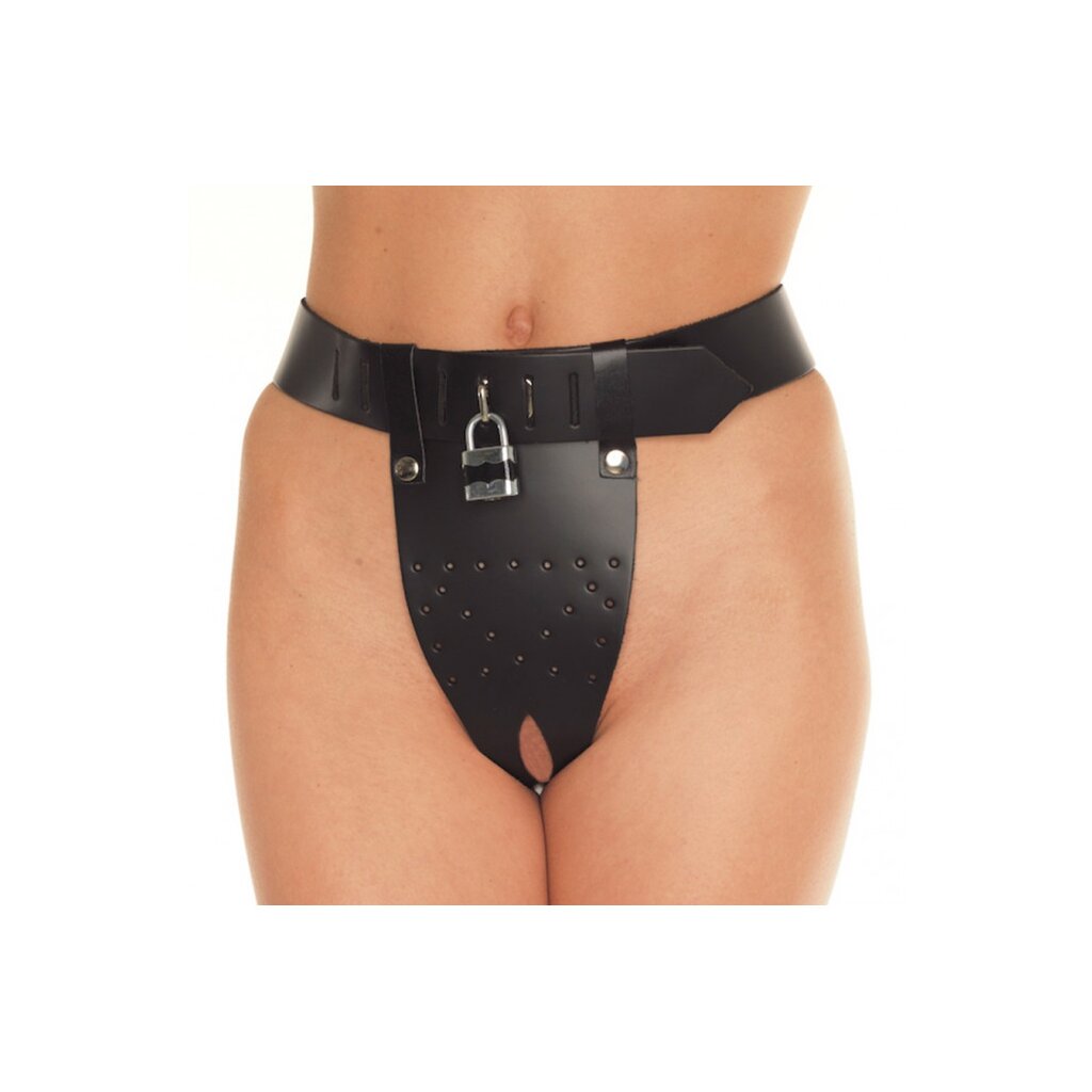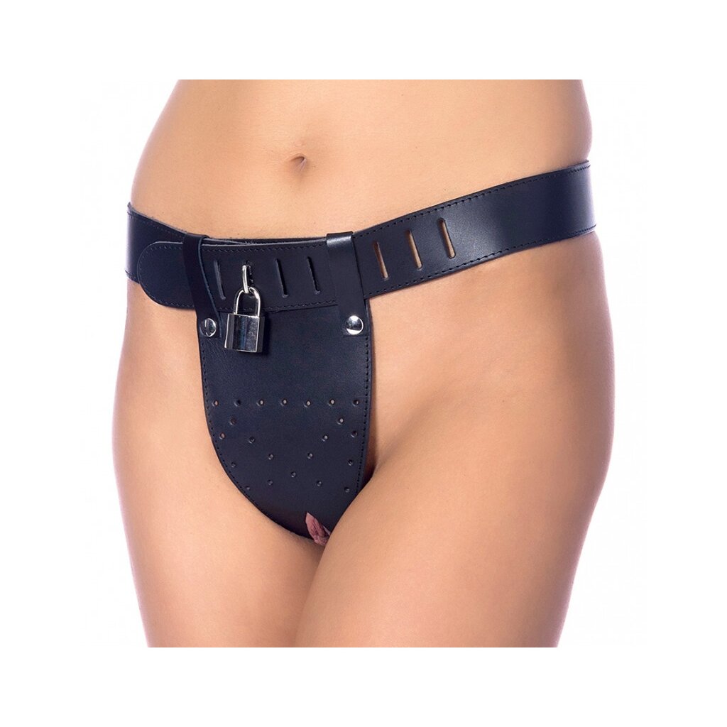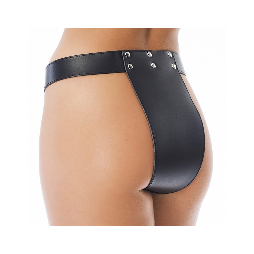 Dieser Keuschheitsslip von Rimba bringt Kontrolle auf den Punkt. Gefertigt aus stabilem, schwarzem Sattelleder, betont er die Hüfte mit klarer Linienführung – während zwei runde Öffnungen im Schritt die Spannung gezielt verstärken. Offen, aber sicher. Hart, aber edel.