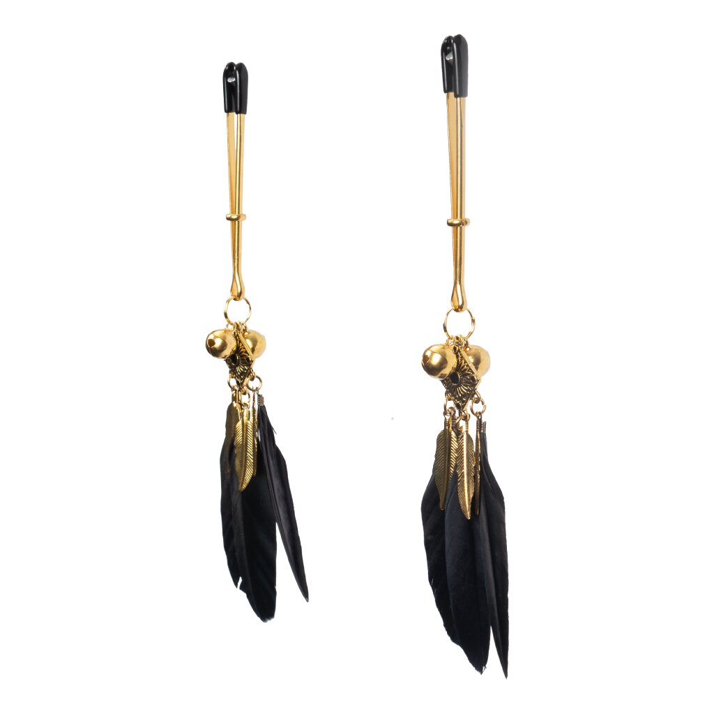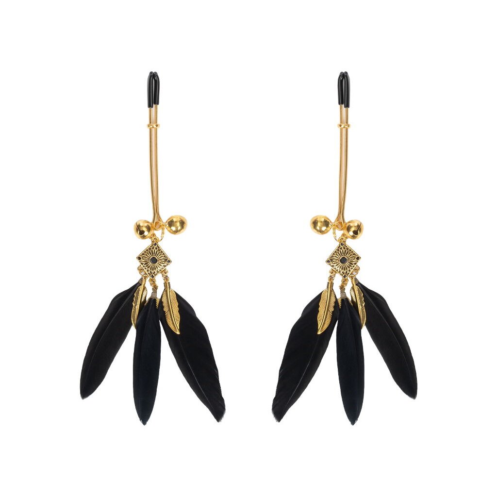 Les embouts en caoutchouc amovibles permettent d’adapter la sensation et d’augmenter l’intensité selon ton envie. Deux petits grelots tintent délicatement à chaque mouvement, tandis que l’ornement avec ses plumes dorées et noires ondule avec grâce, ajoutant une touche visuelle séduisante.