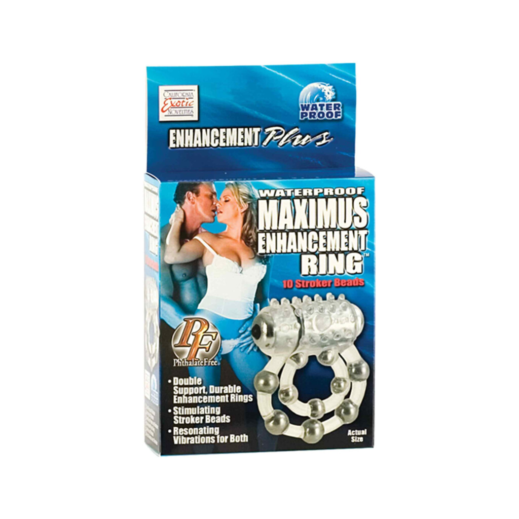 Elevate mutual enjoyment and shared satisfaction with the Waterproof Maximus Enhancement Ring 10 Stroker Beads. The erotic enhancer is soft, stretchy and features a removable mini vibrating bullet and strategically placed stroker beads and love nodules, for maximum orgasmic pleasure. The dual erection enhancer measures a compact 2.5”x 2”/6 cm x 5 cm and is made from transparent, flexible phthalate-free TPR. The ultra supple and stretchy enhancer ring features double support rings with stimulation beads for him and an erotically textured clitoral stimulation sleeve for her pleasure. The textured sleeve accommodates the removable ABS with silver plating micro stimulator and delivers intensely satisfying ecstasy.The erection enhancer is the ideal pleasure tool for spontaneous fun in the hot tub, bath or shower. Slip on the comfort fit erection keeper and indulge in unlimited mind-blowing fun. To increase sensitivity and sensations, always use a quality lube with this toy. Add the reusable ring to your toy collection for enhanced shared pleasure. Before and after every use, clean the enhancer with a toy cleaner spray.