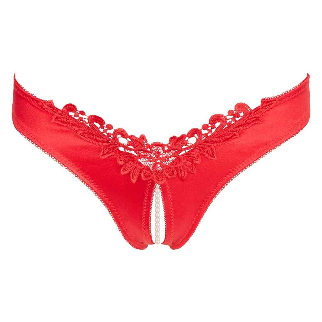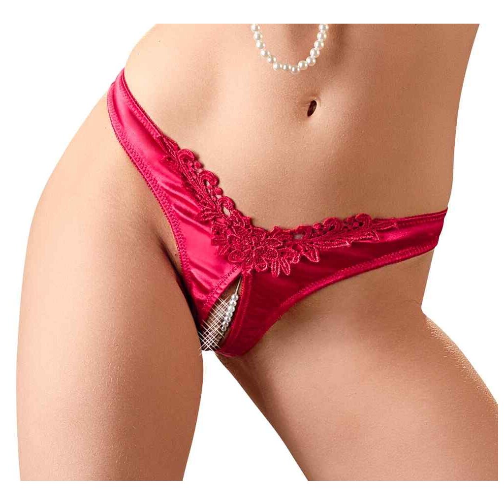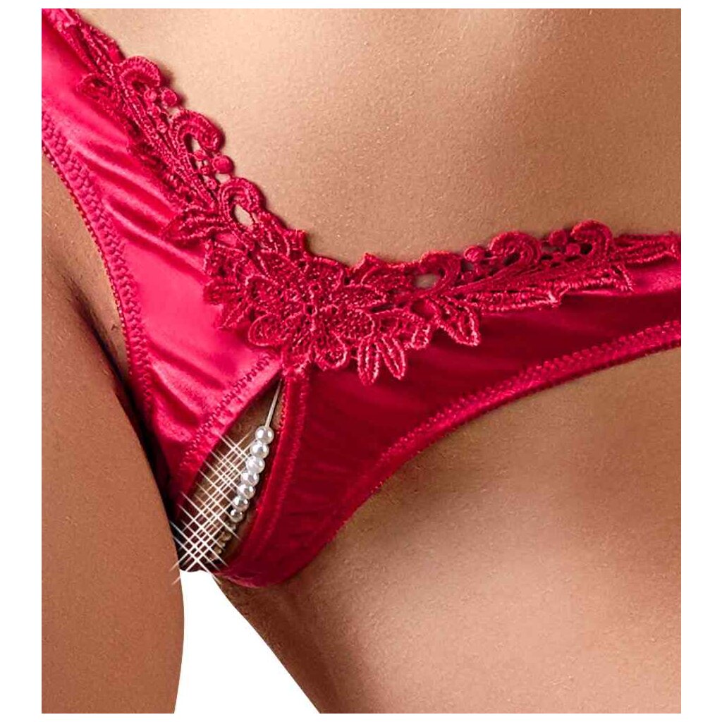 Seductive and stimulating at the same time! Velvety soft crotchless briefs with a row of stimulating pearls over the crotch. Made out of satin with elaborate embroidery at the front.