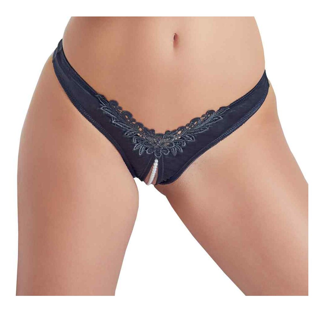 Seidiger Slip ouvert mit stimulierender Perlenkette durch den Schritt. Aus Satin mit aufwendiger Stickerei in der Front.
