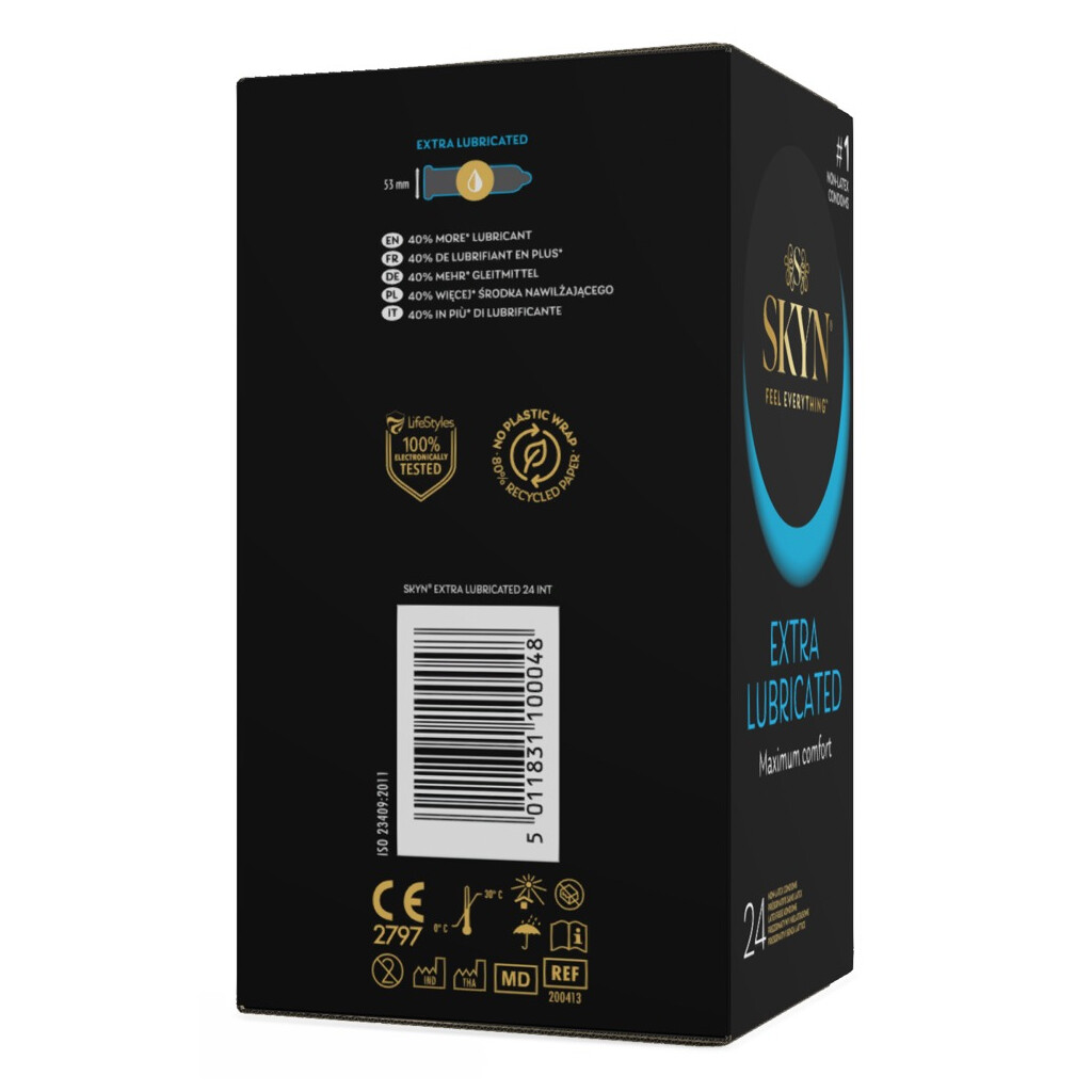 Extra thin, transparent condoms Extra Lubricated by SKYN with 40% more silicone-based lubricant for a soft, sensual feel and optimal comfort. Made from Sensoprene (polyisoprene): soft and silky, latex-free and odorless – ideal for those with latex allergies or sensitivities. With reservoir. Vegan.