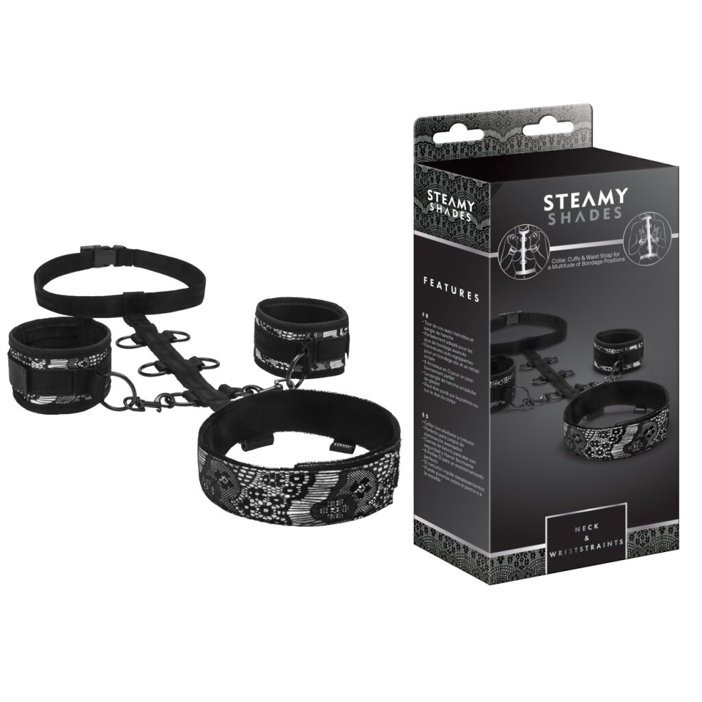 Collar with cuffs and waist strap, perfect for advanced bondage games, Velcro fasteners for secure bondage and easy removal, 6 D-rings for perfect positioning, waist strap prevents slipping, can be worn on the chest or on the back of the body. One Size / Material composition: collar & cuffs (100% polyester); straps & waist belt (100% polypropylene); rivets, rings, D-rings & carabiners (100% nickel-free iron); connecting piece on collar (100% polyurethane); fastener (100% ABS plastic)