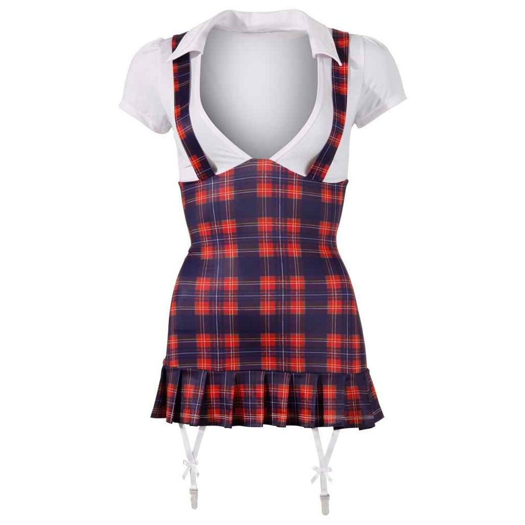 Cette robe est l'uniforme parfait. La partie supérieure est un chemisier blanc décolleté avec des manches courtes et un col. Il y a aussi une partie jupe à carreaux bleu/rouge cousue et ses bretelles passent sur les seins et se croisent dans le dos. Avec un ourlet court plissé et deux bretelles blanches à l'avant. Matière : 92% polyester, 8% spandex.