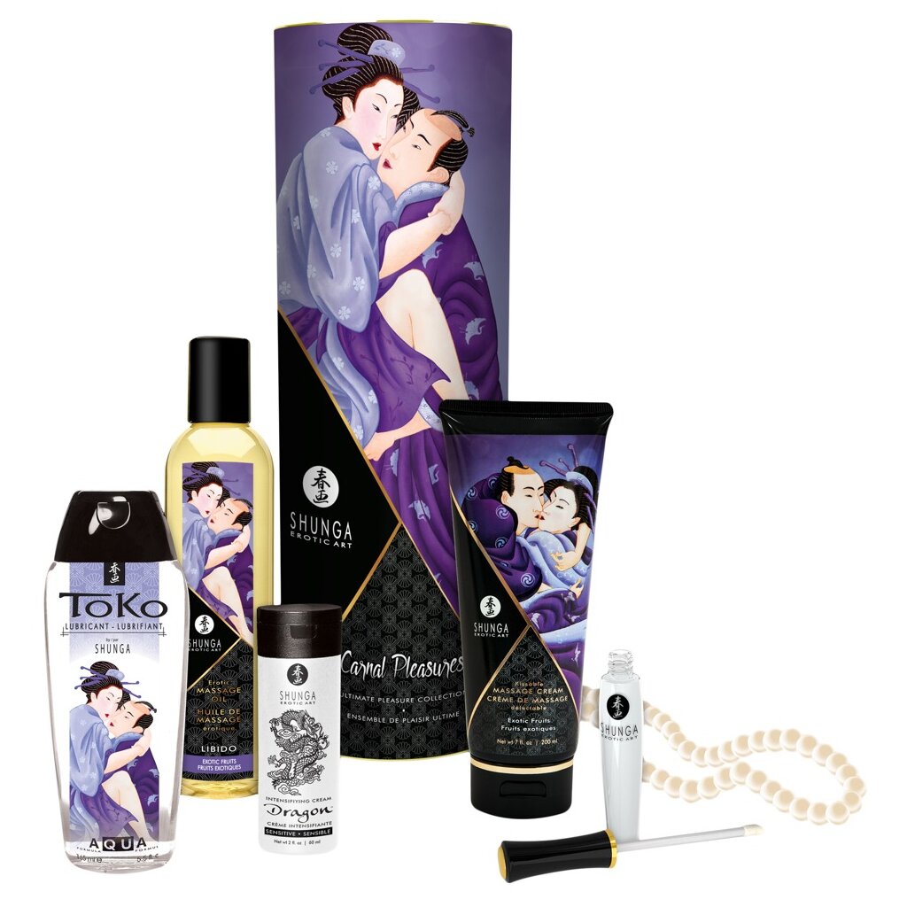 The Carnal Pleasures set contains a white pearl necklace and 5 luxurious original Shunga products for sensual partner massages and passionate love games. Both massage products have a beguilingly exotic fruit flavour that awakens all the senses and makes you want to touch and nibble. Plus an effective oral sex lip gloss, an excellent toko gel and a sophisticated stimulation cream for exciting sensations.