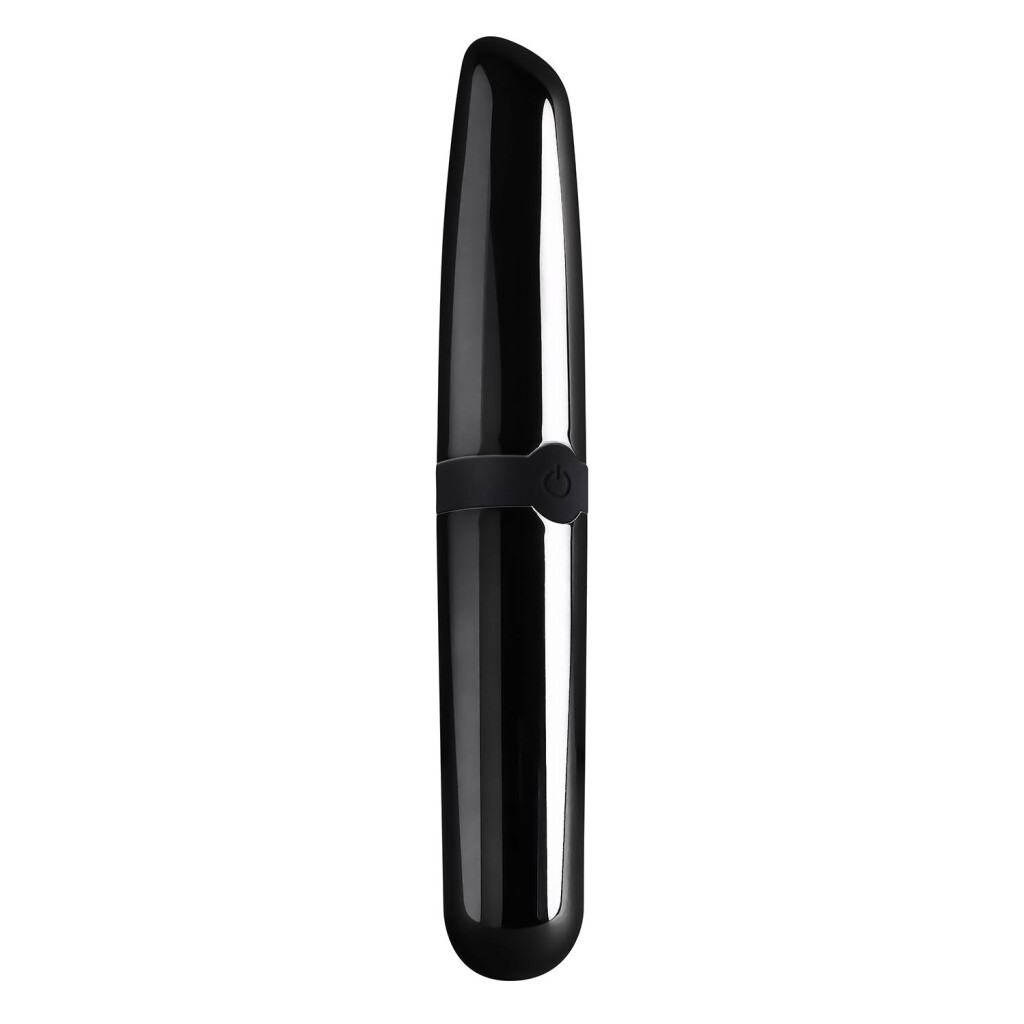 Un puissant ogive vibrant au look élégant, noir et chromé. Double extrémité avec une forme de rouge à lèvres d'un côté et une pointe arrondie de l'autre.