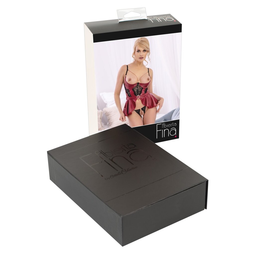 Rhinestoned longline halter with flounce plus lace thong ouvert in a set by Abierta Fina. The longline halter in a mix of matt look and fine lace lifts the bust perfectly with its slightly padded underwire cups and presents it offensively framed with rose gold-colored chains. The waist is emphasized in a belt look with a large rhinestone buckle, the hips are sensually embraced by the swinging flounce. In addition, the completely crotchless lace thong seduces with a stimulating crotch chain in rose gold shine. Chain all removable; straps adjustable.