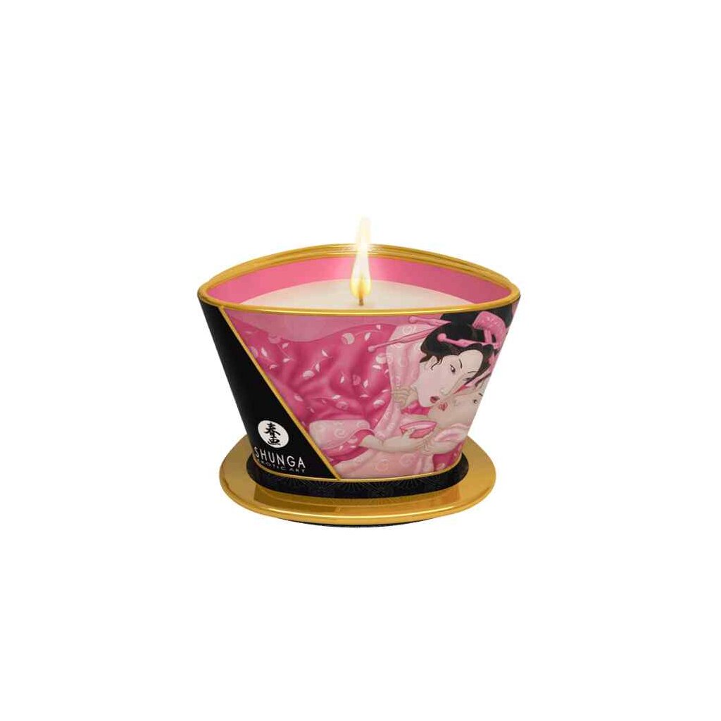 Bougie de massage Pétales de rose.Cette bougie à base de soja peut être utilisée à la fois comme bougie d'ambiance et huile de massage intime.
