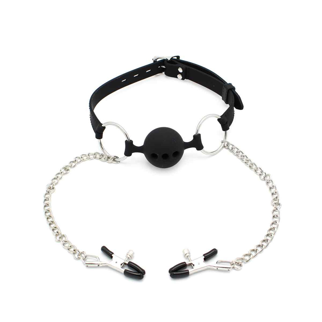 This 2-in-1 BDSM ball-gag will have your partner acting like the best submissive that you crave. Stuff their mouth with the soft silicone ball gag, taking away their ability to speak and leaving them feeling helplessly horny. Attach the nipple clamps that dangle from the gag, giving you the option to tease your plaything with light pressure, or satisfy their masochism with a tight pinch! The Soft Silicone Material is silky smooth and feels amazing, made from high quality silicone from Kiotos X.