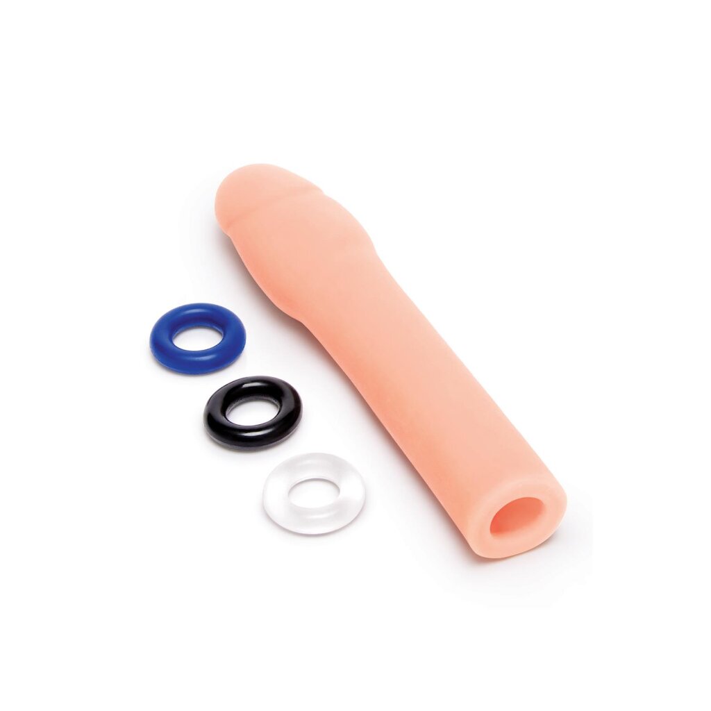 The realistic 2-inch extender from Size Up lengthens and enlarges your member. The realistic shape provides extra stimulation for the partner receiving the member. Made from ultra-soft and body-safe material, the extender can be easily trimmed for the best fit and provides full stimulation for both partners. Use the three included rings to increase your stamina and enhance your pleasure.