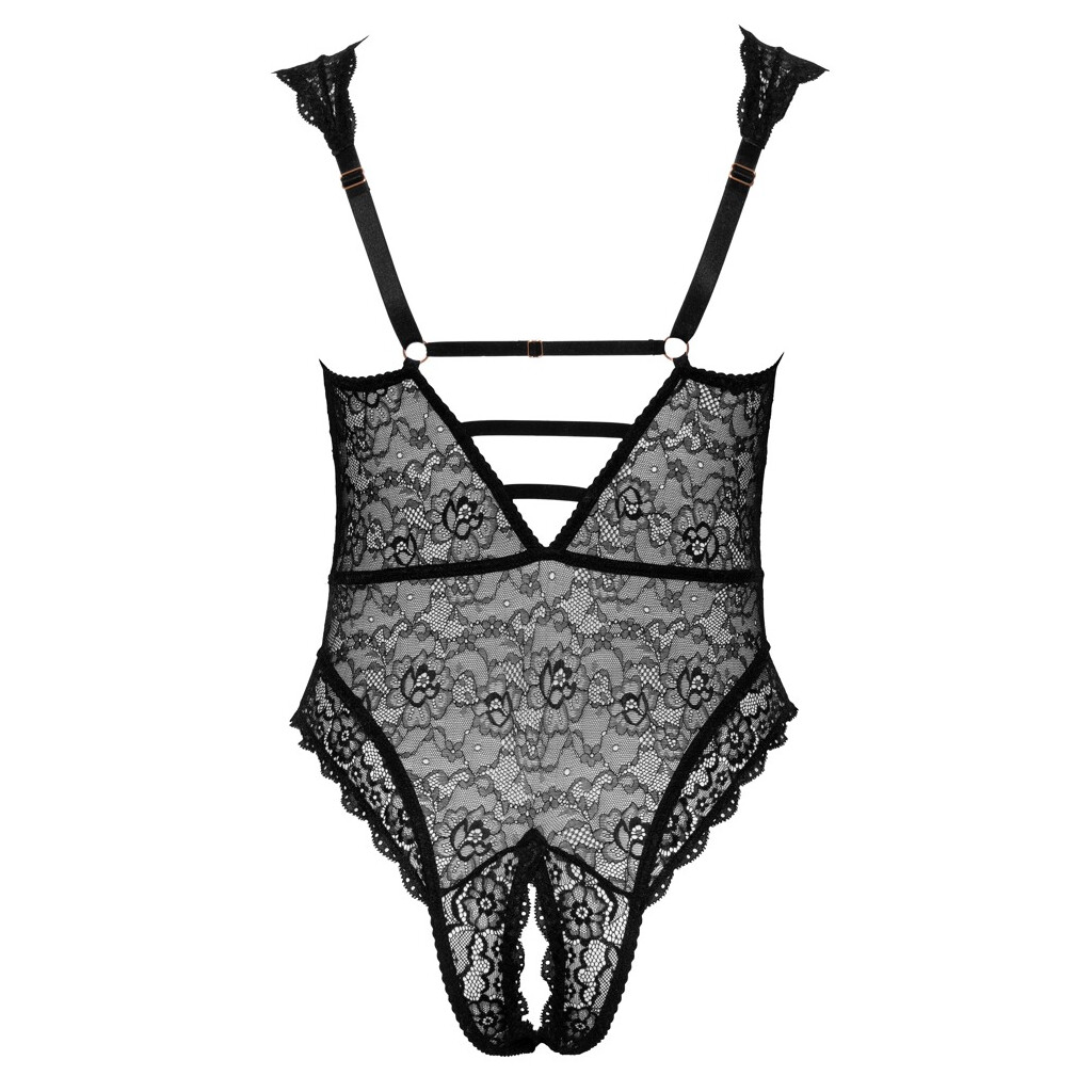 Body ouvert von Cottelli CURVES ganz aus feiner Spitze mit roségoldfarbenen Details. Mit Bügel-Cups und dekorativen Stretchbändern im tiefen Dekolleté, sowie im v-förmigen Rückenausschnitt. Rundum elastisch und anschmiegsam für eine enge Passform mit höchstem Tragekomfort. Im Schritt einladend offen. Die breiten Träger sind in der Länge verstellbar für eine perfekte Passform.
