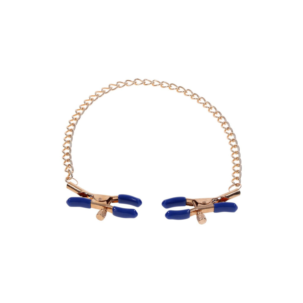 Diese exquisiten Klammern verfügen über eine goldene Kette und auffällige blaue Gummispitzen, die Eleganz mit einem Hauch von wilder Verspieltheit verbinden. Perfekt für BDSM-Neulinge oder erfahrene Enthusiasten. Die verstellbaren Daumenschrauben ermöglichen es Ihnen, den Druck zu kontrollieren und sorgen für ein maßgeschneidertes Erlebnis. Die schimmernde Goldkette verleiht nicht nur einen raffinierten Touch, sondern bietet auch eine verlockende Gelegenheit für sanfte Züge, wenn die Leidenschaft intensiver wird. Lassen Sie Ihrer Fantasie freien Lauf und erforschen Sie die verlockenden Empfindungen, die diese vielseitigen Klammern an verschiedenen Stellen Ihres Körpers hervorrufen können.