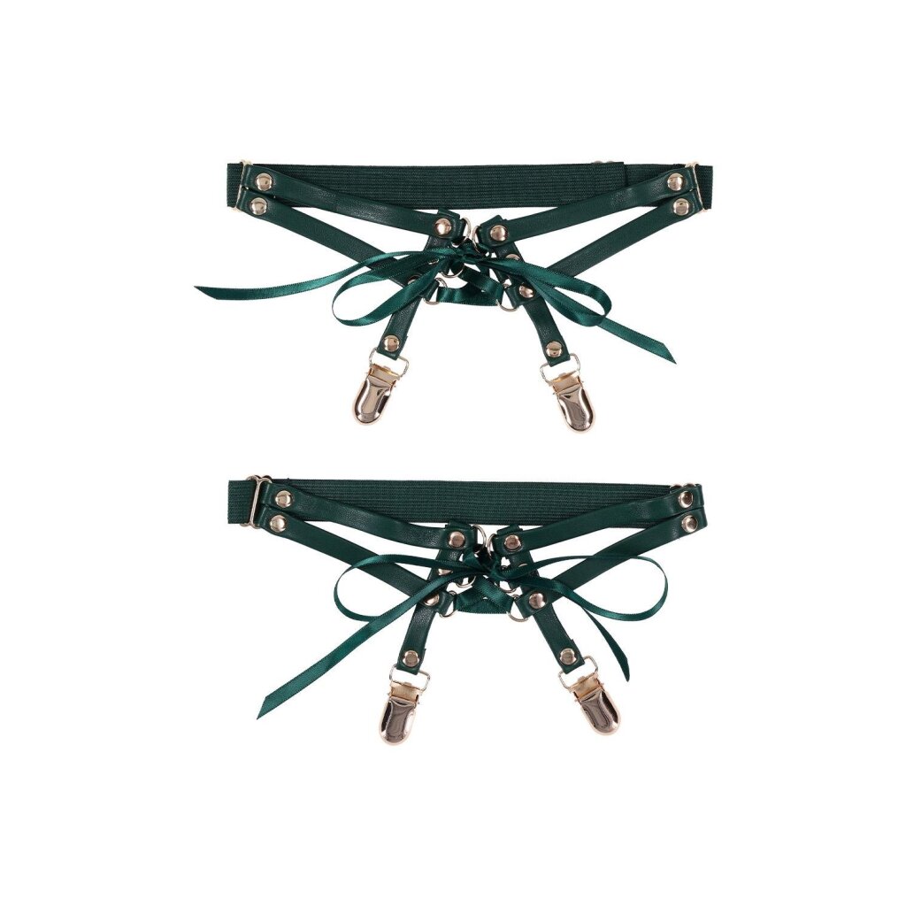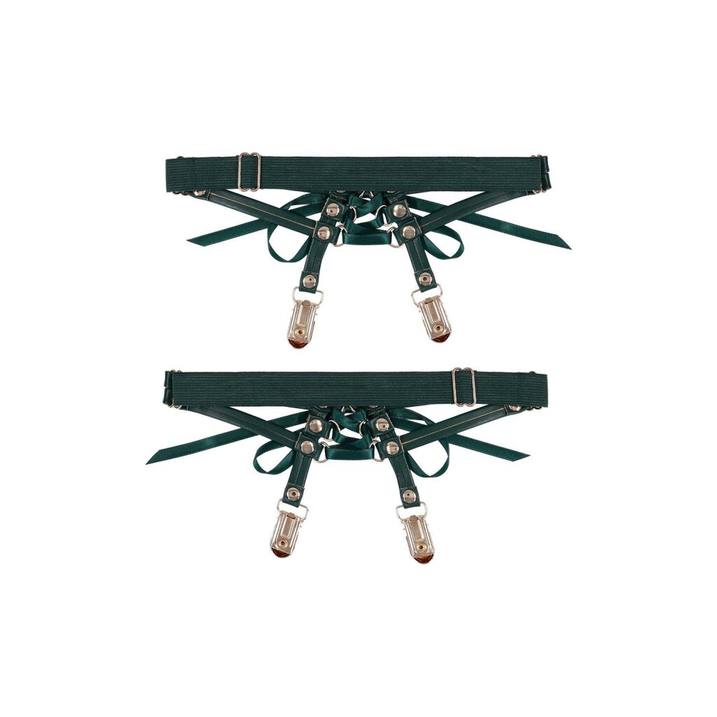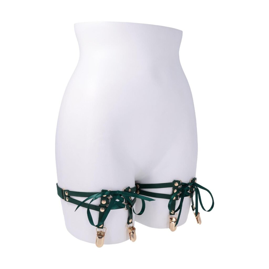 The Sportsheets Indica Lace-Up Garters add a refined hint of bondage to your lingerie collection. Emerald-toned faux leather wraps smoothly around the thighs, while satin laces tie closed in a corset-inspired design that allows for a perfectly adjustable fit. The result is a confident balance of structure, elegance, and allure.