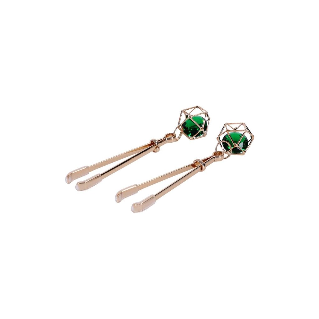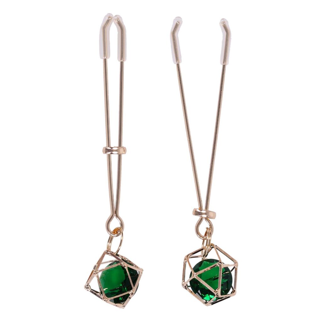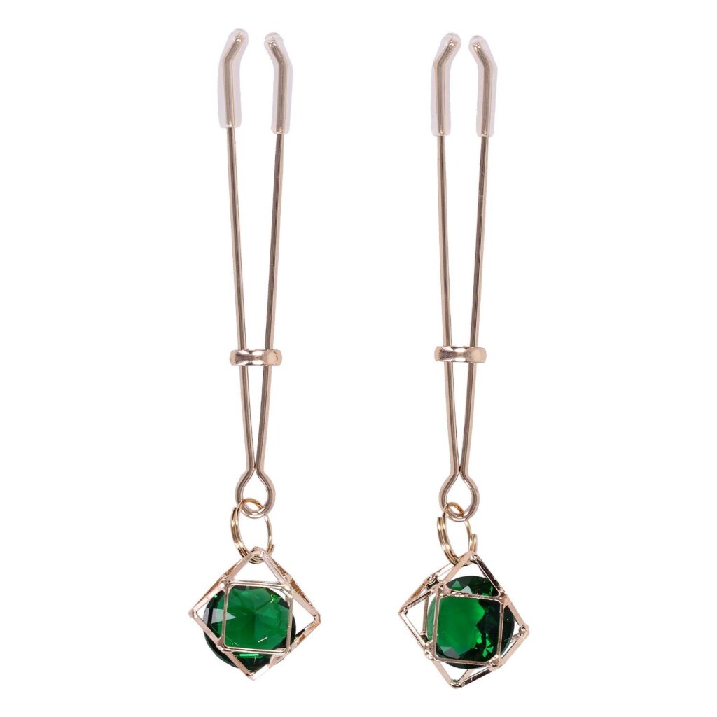 Un cristal vert suspendu et des éléments métalliques dorés apportent une touche glamour qui capte le regard. Qu’elles soient portées pour sublimer une tenue ou pour découvrir la stimulation en douceur, ces pinces offrent un équilibre subtil entre contrôle, esthétique et plaisir.