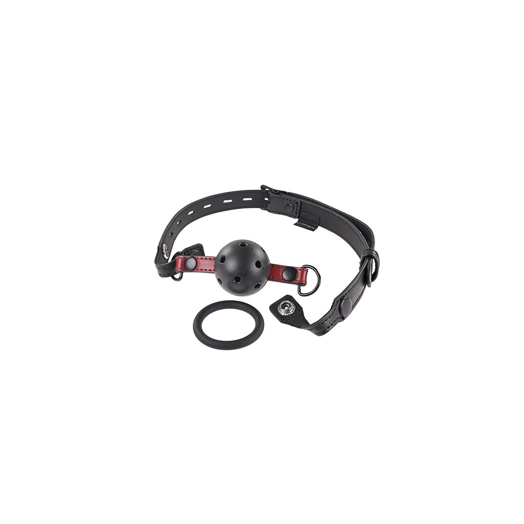 Add the "shhhh" to sultry with bright scarlet accents on a black satin finish. Luxurious faux leather and your choice of bite ring or breathable ball gag make the Saffron Interchangeable Gag a versatile must-have for any bondage collection. Simply unsnap each side of the gag to change out pieces for multiple ways to play.