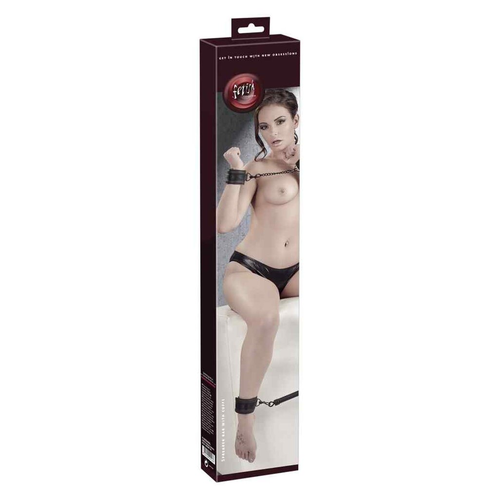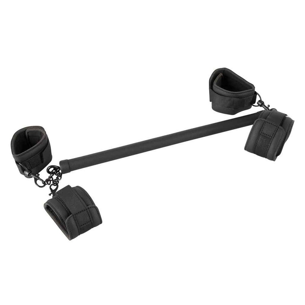 Sturdy spreader bar with handcuffs and ankle cuffs that can be attached at either end. The included imitation leather restraints are softly padded and can be adjusted with the hook and loop fasteners. The restraints can be attached to the spreader bar with the snap hooks. The short metal connection chain can be used to join the restraints together so that they can also be used on their own.