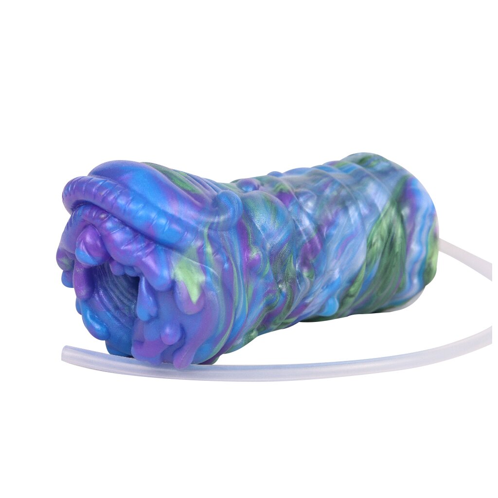 Der Masturbator verfügt über eine Spritze, mit der er von innen mit Gleitmittel befüllt und so zum Tropfen gebracht werden kann.