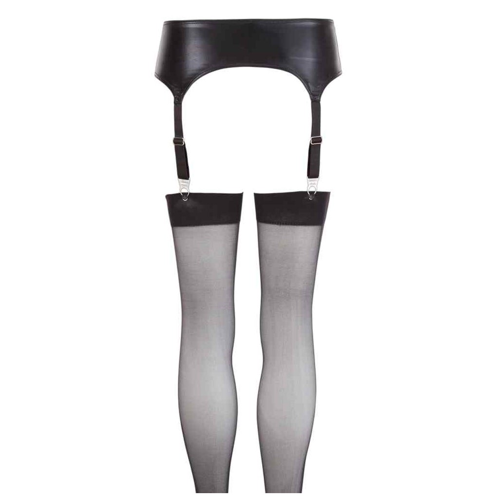 Porte-jarretelles noir à effet mouillé et bas assortis dans un ensemble. Ceinture : 92% polyester, 8% spandex. Bas : 100% polyamide.