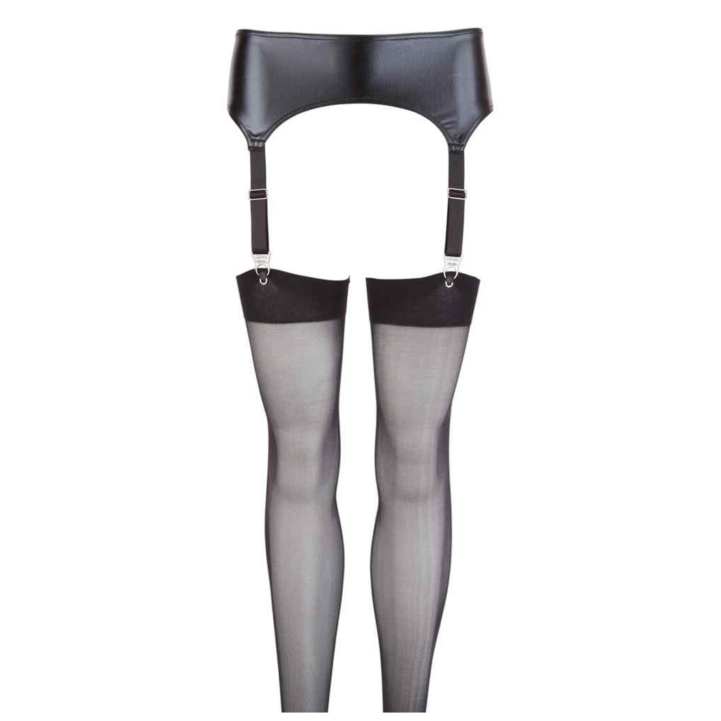 Porte-jarretelles noir à effet mouillé et bas assortis dans un ensemble. Ceinture : 92% polyester, 8% spandex. Bas : 100% polyamide.
