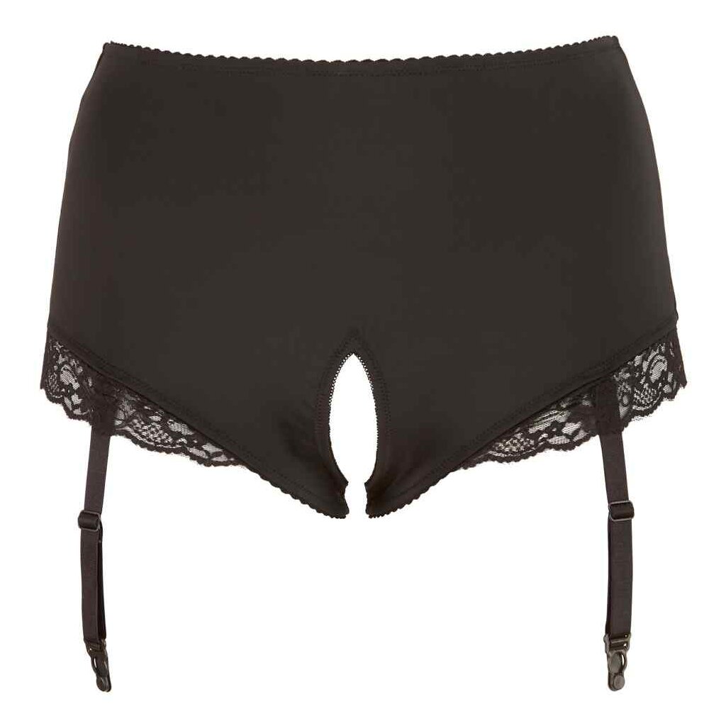 Allow cheeky glimpses! These black briefs are extremely hot because they are open in the crotch area. The four adjustable and removable suspender straps and the elegant lace inserts around the legs add the finishing touch to this sexy lingerie! The sturdy material at the front shapes your stomach slightly. 95% polyester, 5% spandex.