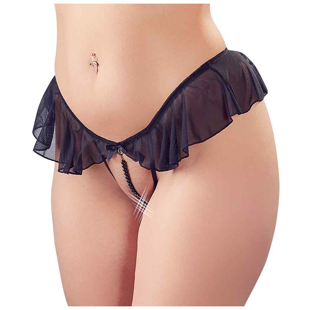 A sensual crotchless G-string with figure-flattering frills and a row of black pearls over the crotch area. The open crotch area is seductively framed by 2 stretchy straps.