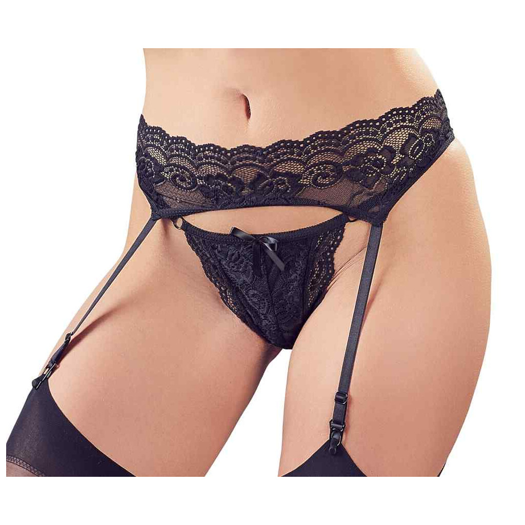 The perfect duo for lots of hot nights! Beautiful lingerie set made out of stretchy lace. Includes a tiny string with stretchy straps and a suspender belt with adjustable suspender straps. Without stockings.