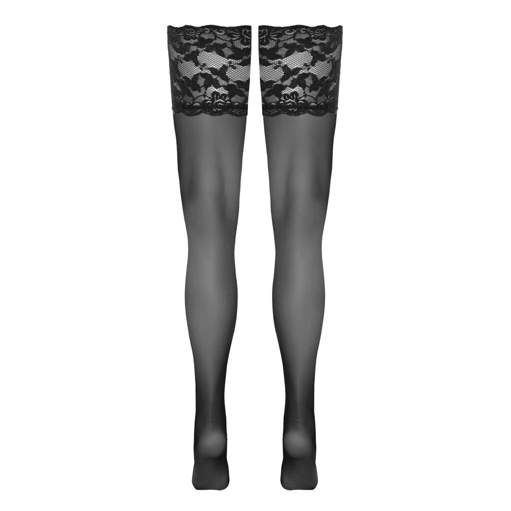 Bas de contention noir de Cottelli LEGWARE avec un magnifique bout de dentelle de 14 cm de large. Avec renfort en silicone à l'intérieur pour un ajustement antidérapant et un maintien optimal. Epaisseur du fil 20 deniers. Certifié Oeko-Tex.