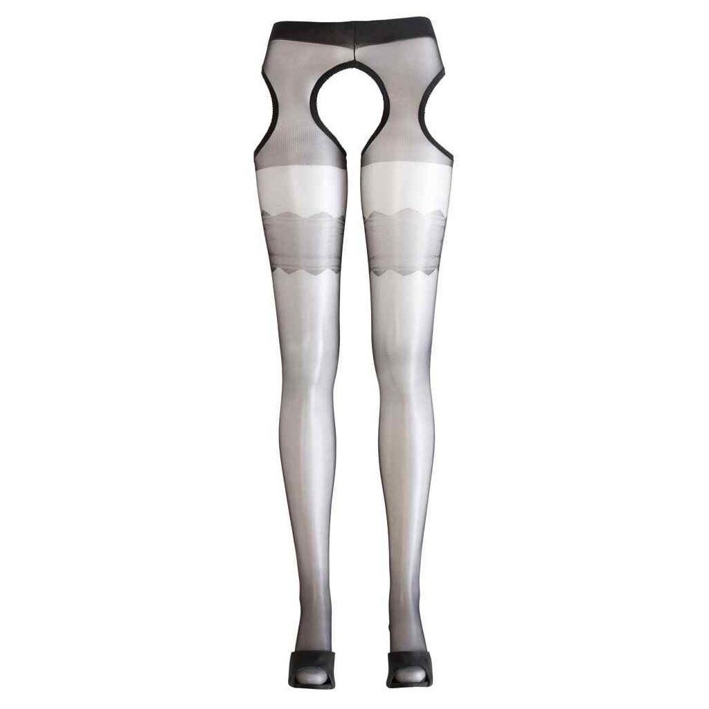 Exciting and crotchless! Fancy suspender tights with cut-outs at the sides and an exciting open crotch. The sewn-on garters are additional sexy eye-catchers. 20 denier. Oeko-Tex standard 100 certified.