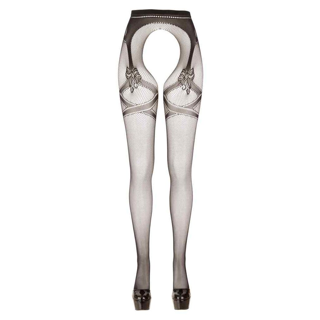 Seidig weiche Netzstrumpfhose ouvert mit eingewebtem Strumpfband und Ziernaht hinten.