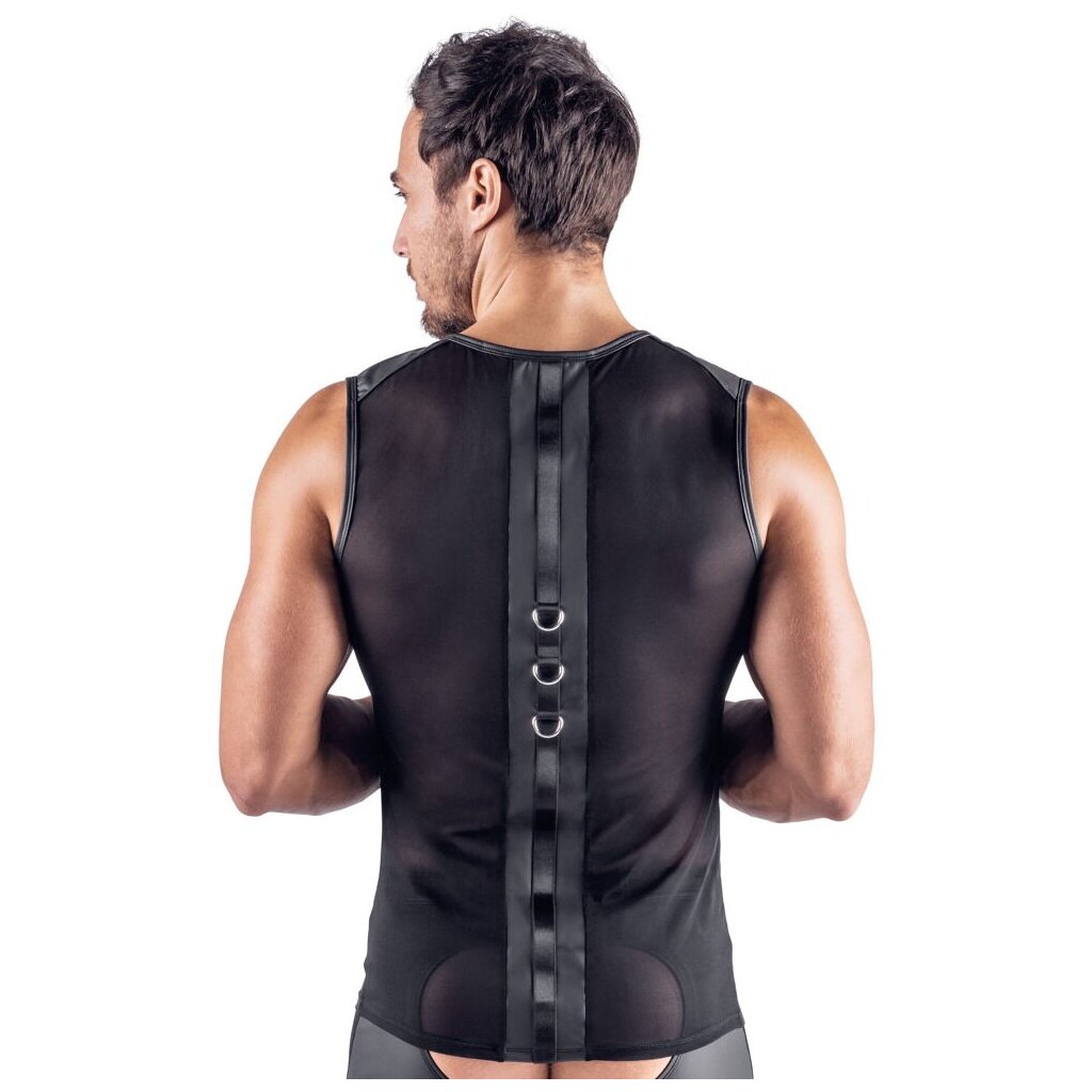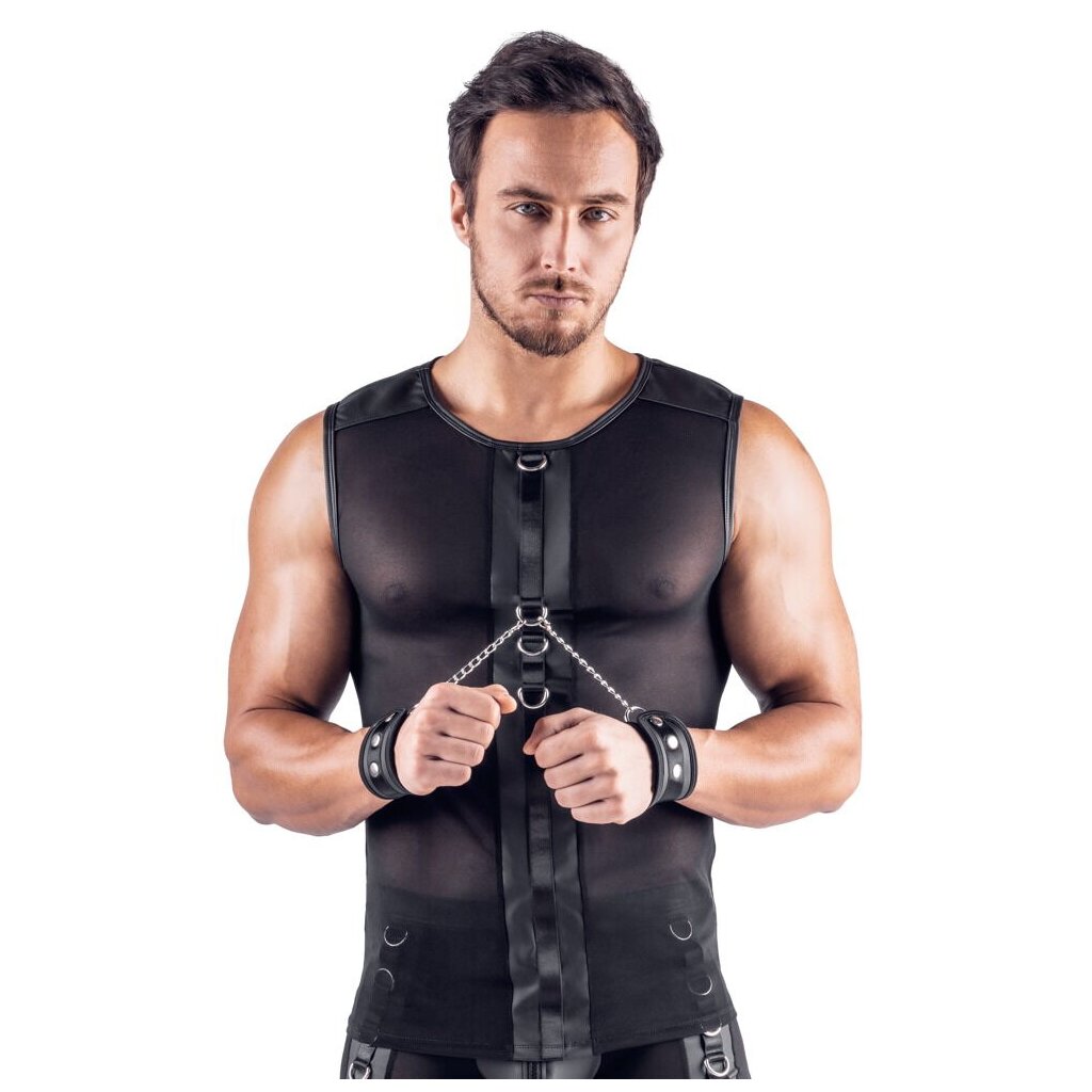 Dieses ärmellose Netz-Shirt legt sich weich und elastisch an deinen Oberkörper und zeigt deine Konturen durch seine transparente Struktur besonders reizvoll. Die Kombination aus Netzmaterial und mattem Einsatz erzeugt einen sinnlichen Kontrast, der deine Silhouette betont und dem Design eine kraftvolle Tiefe verleiht. Sowohl vorne als auch im Rücken sitzt mittig ein Mattlook-Bereich mit stabilen Fesselringen, die als zentrales Bondage-Element dienen.