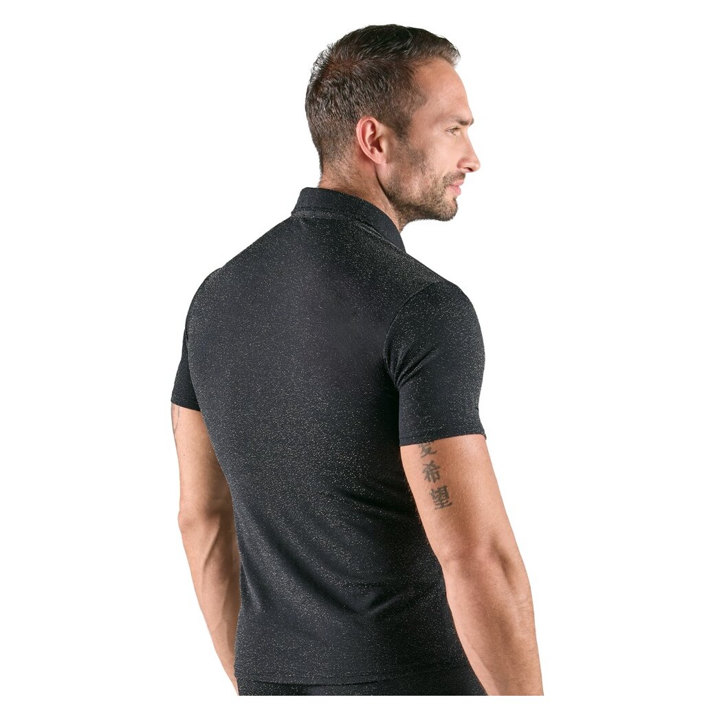 Chemise moulante à manches courtes de Svenjoyment, couleur argent chatoyant, légèrement transparente, aspect lurex. Avec col et patte de boutonnage complète sur le devant. Douce et élastique pour un confort maximal.