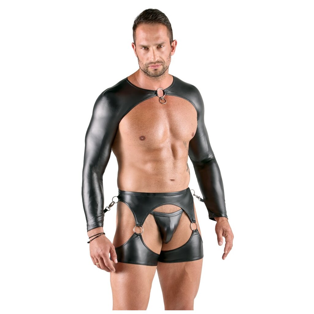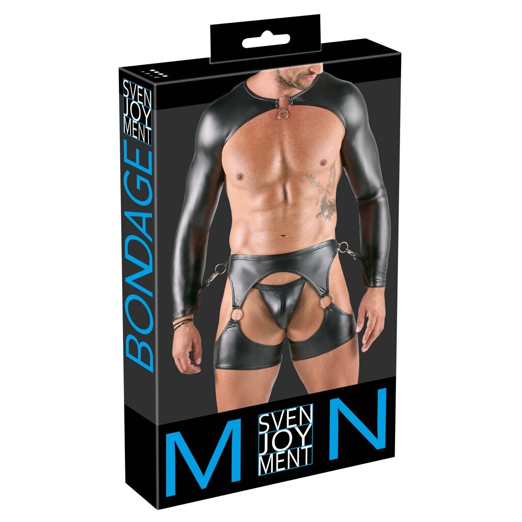 Ensemble 3 pièces de Svenjoyment Bondage avec boléro, ceinture de hanches et jockstrap. Le tout dans un look noir mat très tendance, doux et élastique pour un confort maximal. Avec de nombreux anneaux et mousquetons argentés sur les manches pour des jeux de bondage légers et variés.