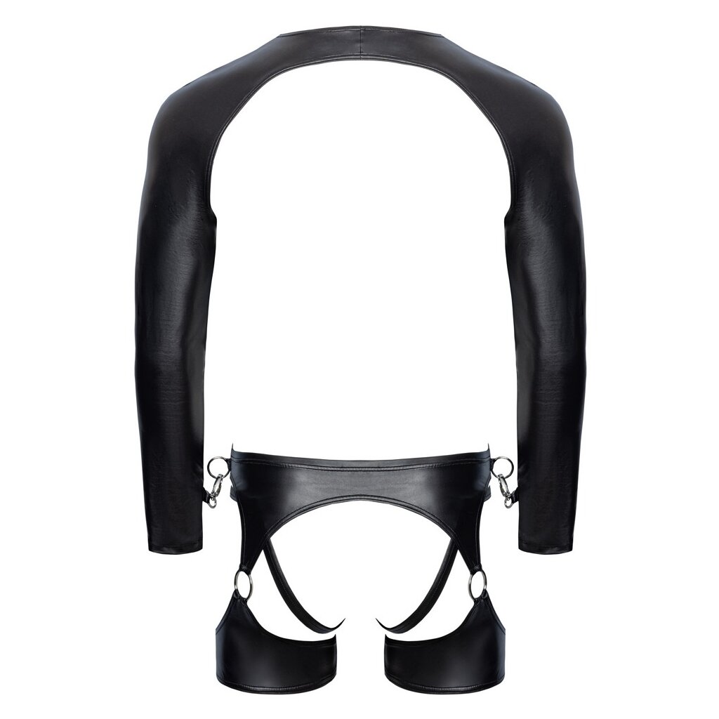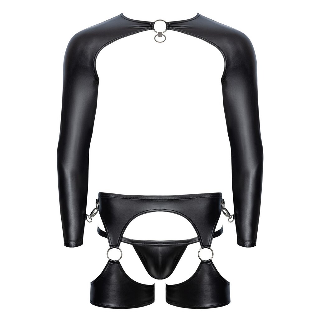 Ensemble 3 pièces de Svenjoyment Bondage avec boléro, ceinture de hanches et jockstrap. Le tout dans un look noir mat très tendance, doux et élastique pour un confort maximal. Avec de nombreux anneaux et mousquetons argentés sur les manches pour des jeux de bondage légers et variés.