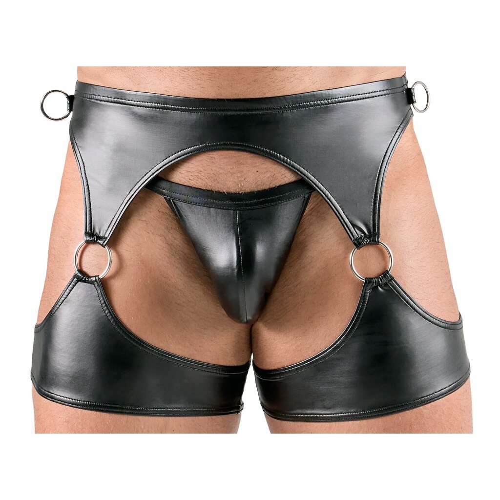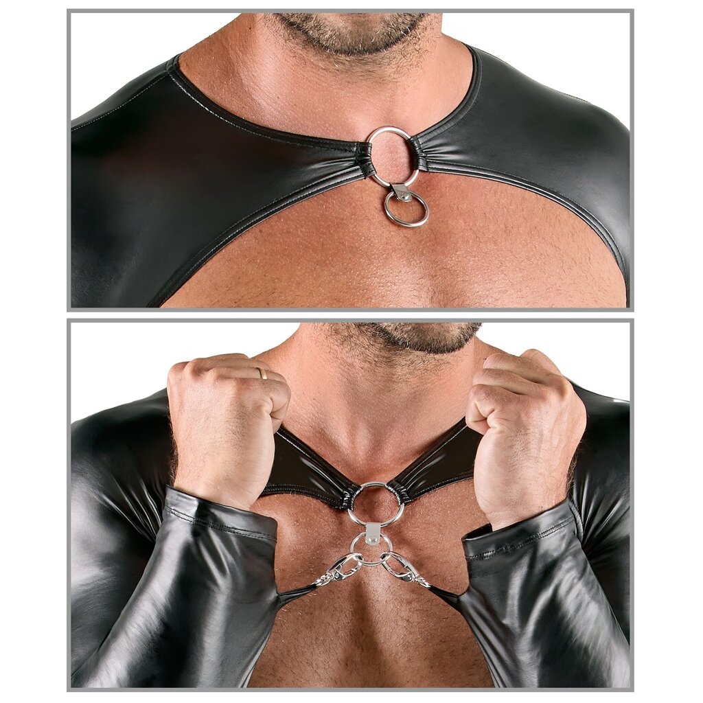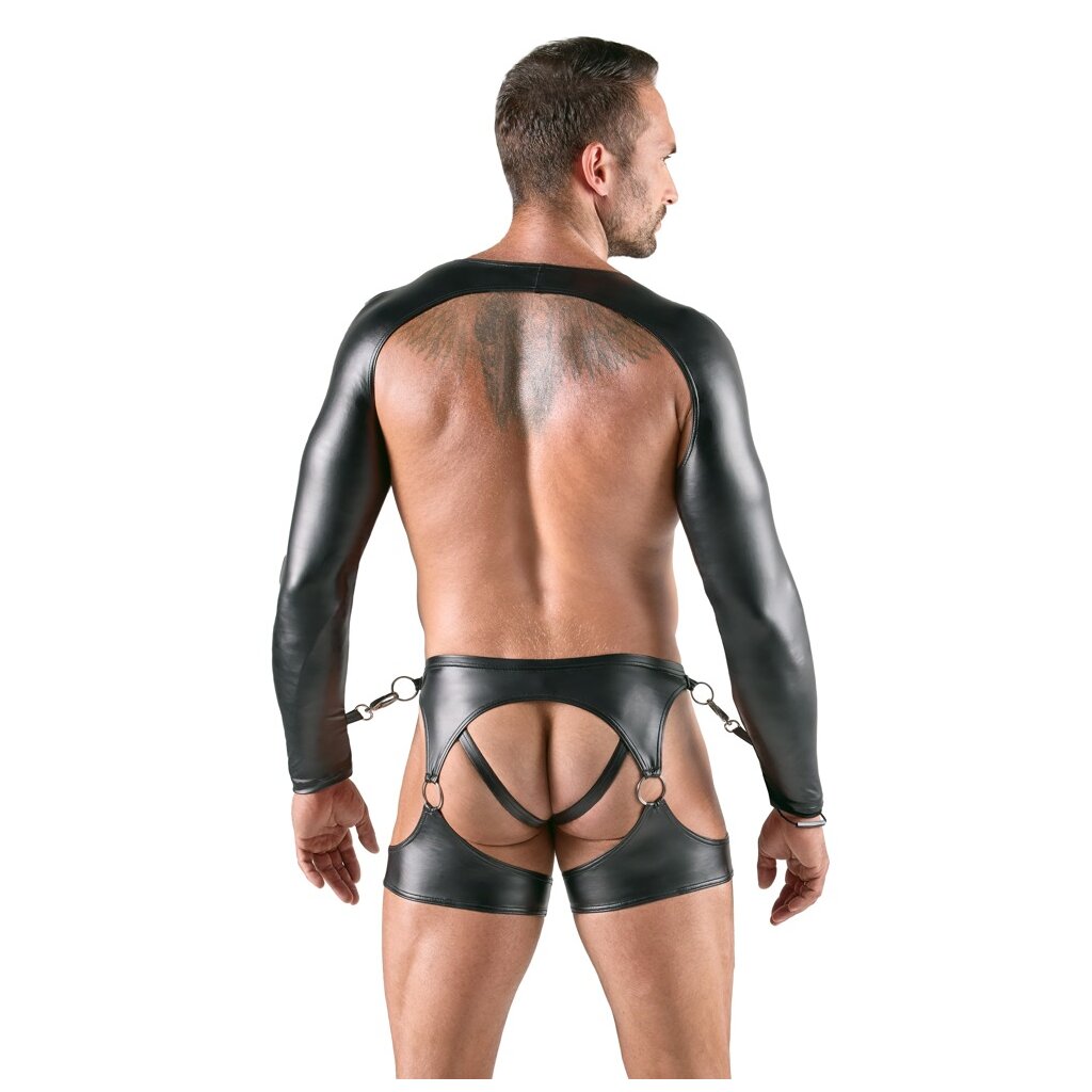 Ensemble 3 pièces de Svenjoyment Bondage avec boléro, ceinture de hanches et jockstrap. Le tout dans un look noir mat très tendance, doux et élastique pour un confort maximal. Avec de nombreux anneaux et mousquetons argentés sur les manches pour des jeux de bondage légers et variés.