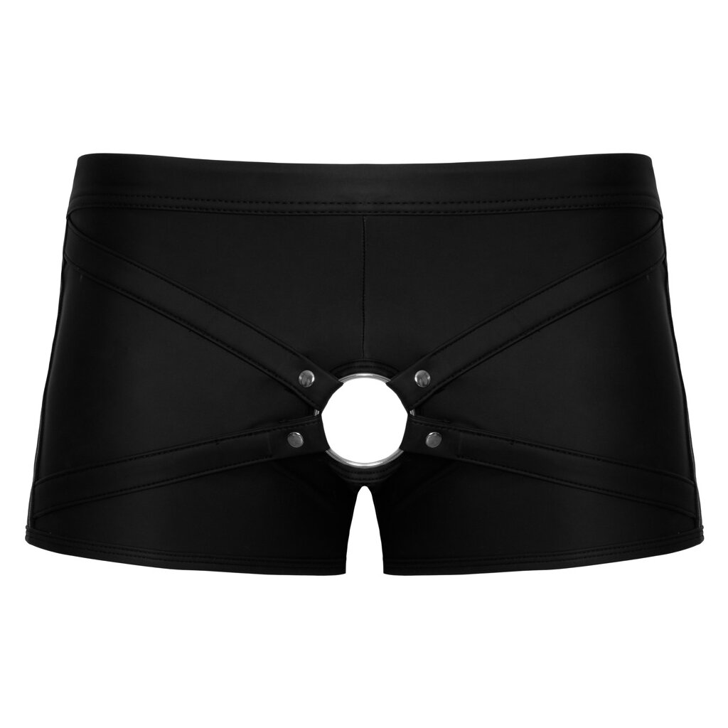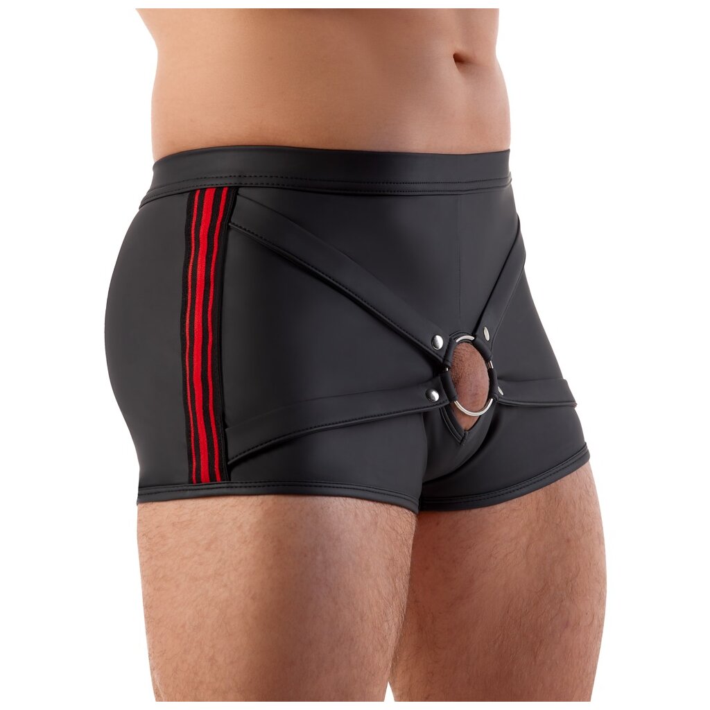 Enge, betonte Pants von Svenjoyment in schwarzer Matt-Optik mit roten, gewebten Gummi-Seitenstreifen. Weich und rundum elastisch für höchsten Tragekomfort. Mit Öffnung für den Penis und Schwellfunktion. Metall-Penisring (Innen-Ø 5 cm) an Stretchbändern mit Druckknöpfen, austauschbar. Jeder leichte Dildo/Vibrator (nicht im Lieferumfang enthalten) mit Saugnapf kann für Strap-On-Spiele in den Ring eingeführt werden.