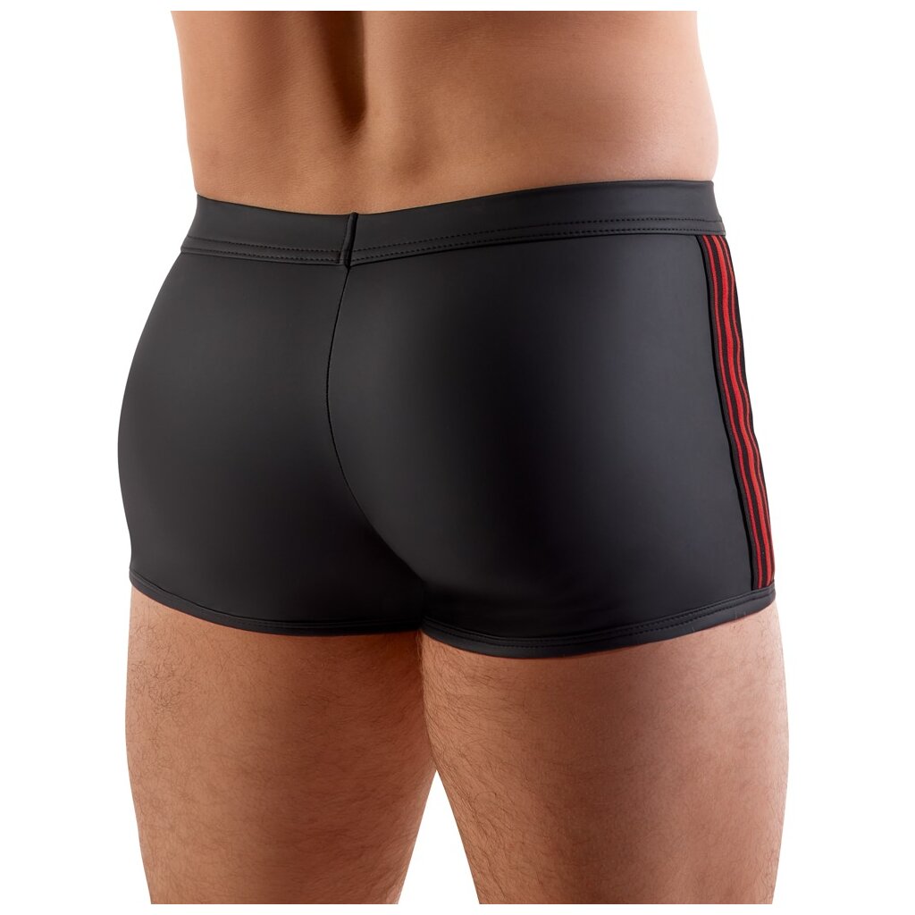 Enge, betonte Pants von Svenjoyment in schwarzer Matt-Optik mit roten, gewebten Gummi-Seitenstreifen. Weich und rundum elastisch für höchsten Tragekomfort. Mit Öffnung für den Penis und Schwellfunktion. Metall-Penisring (Innen-Ø 5 cm) an Stretchbändern mit Druckknöpfen, austauschbar. Jeder leichte Dildo/Vibrator (nicht im Lieferumfang enthalten) mit Saugnapf kann für Strap-On-Spiele in den Ring eingeführt werden.