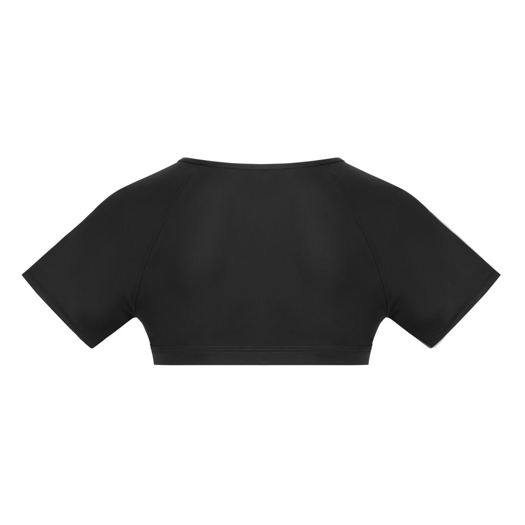 Black, breast- and belly-free half-sleeved shirt from Svenjoyment in a stylish matte look with a transparent mesh insert at the front. Soft and stretchy all over for a high level of comfort. The masculine underbust strap with front ring is adjustable with decorative press studs.
