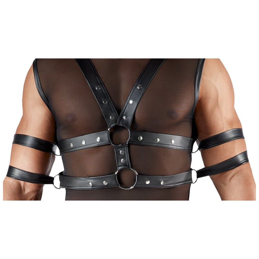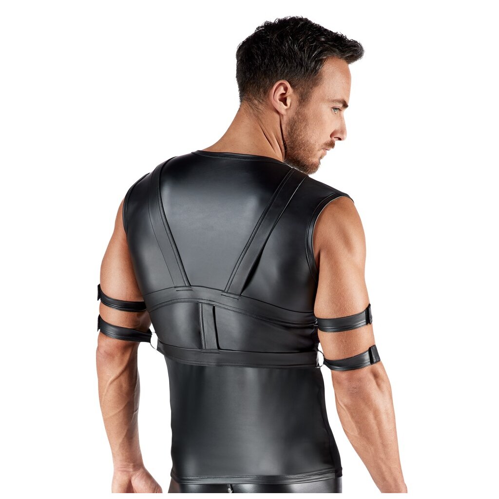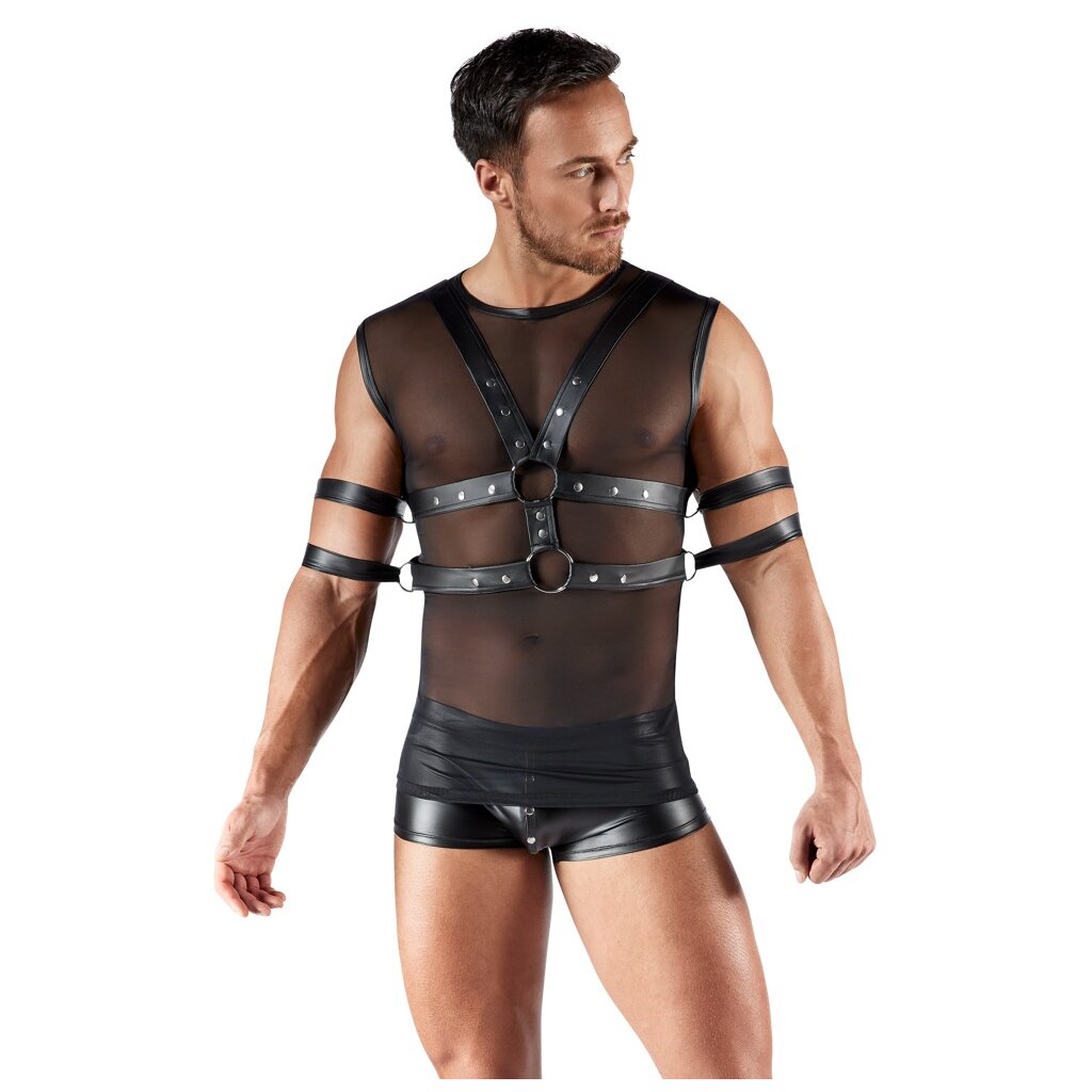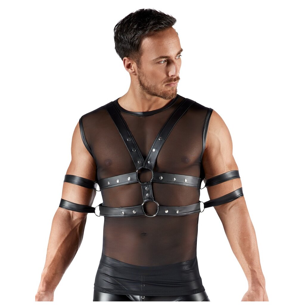 Sleeveless shirt and chest harness as well as 4 hand and arm cuffs in a black set from Svenjoyment BONDAGE. Supple shirt made from fine powernet at the front and a matte look at the back. Cut-outs edged in a matte look. Soft and elastic all over for high wearing comfort. Chest harness with adjustable matte-look straps (press studs). Rings on the sides of the chest and stomach straps through which the enclosed ankle cuffs can be pulled. The soft ankle cuffs can be quickly put on and adjusted with their Velcro fasteners.
