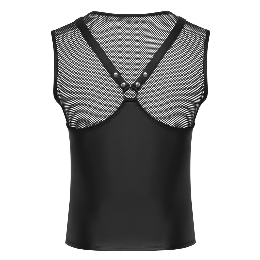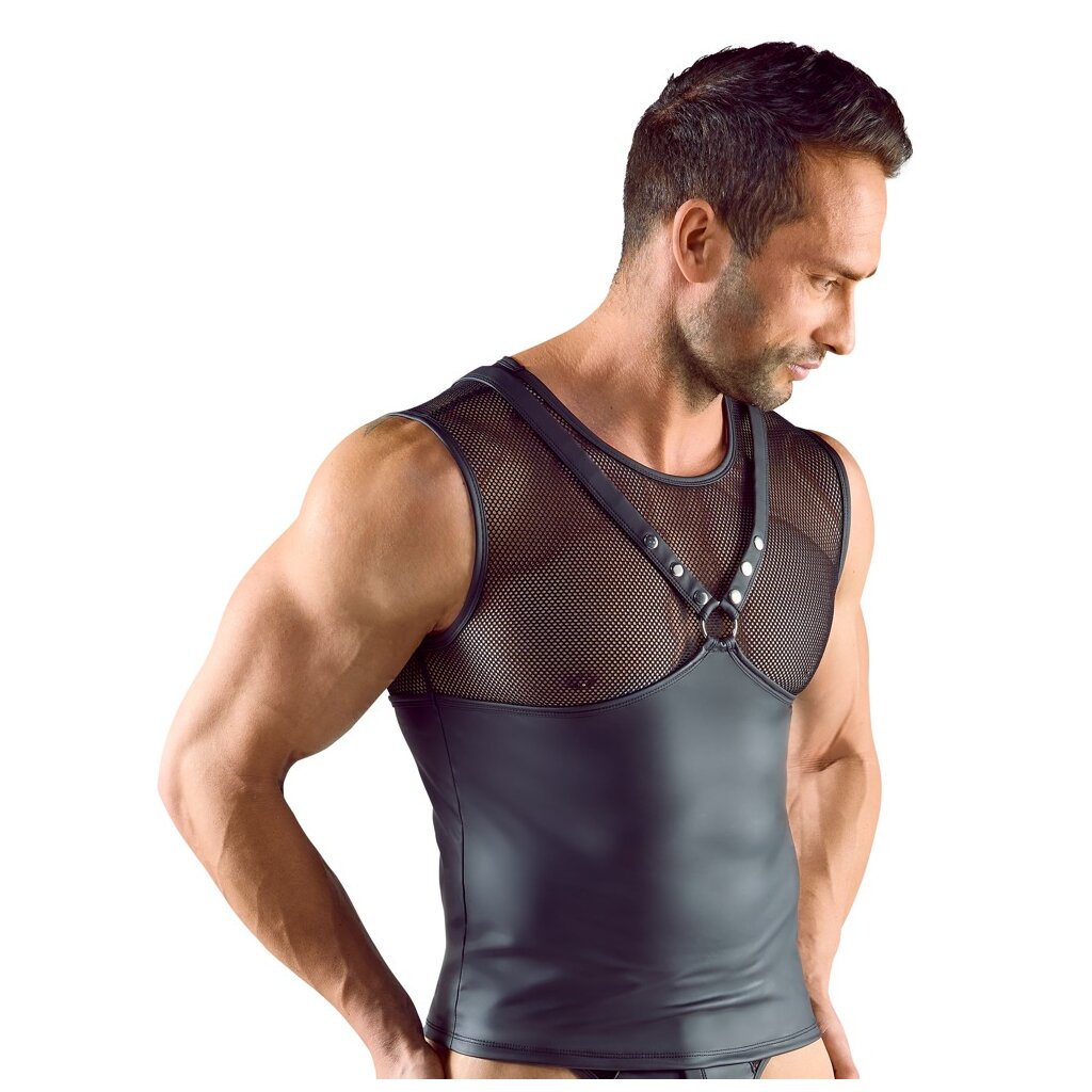 Sleeveless, accentuating shirt by Svenjoyment in a chest harness style with rivets and rings. Black elastic material mix with a high level of comfort: stylish matte look and coarse mesh.