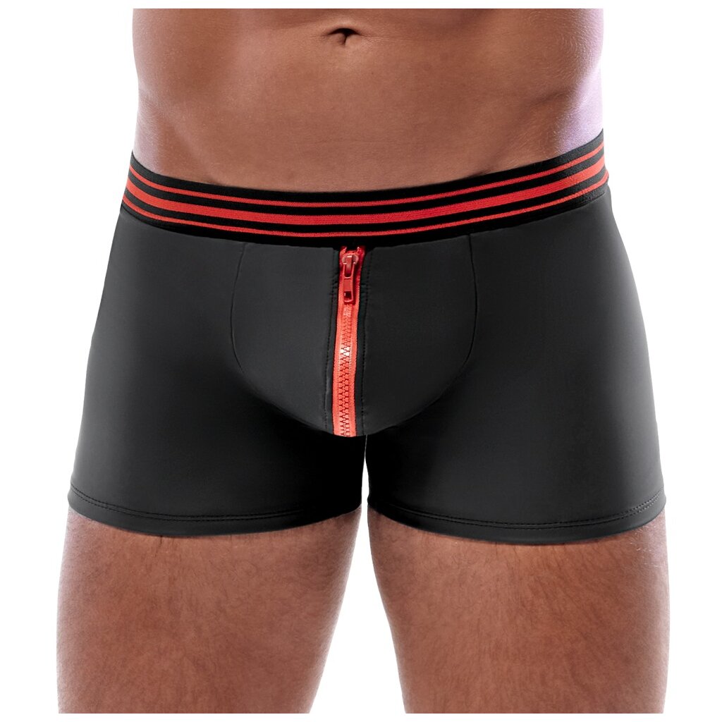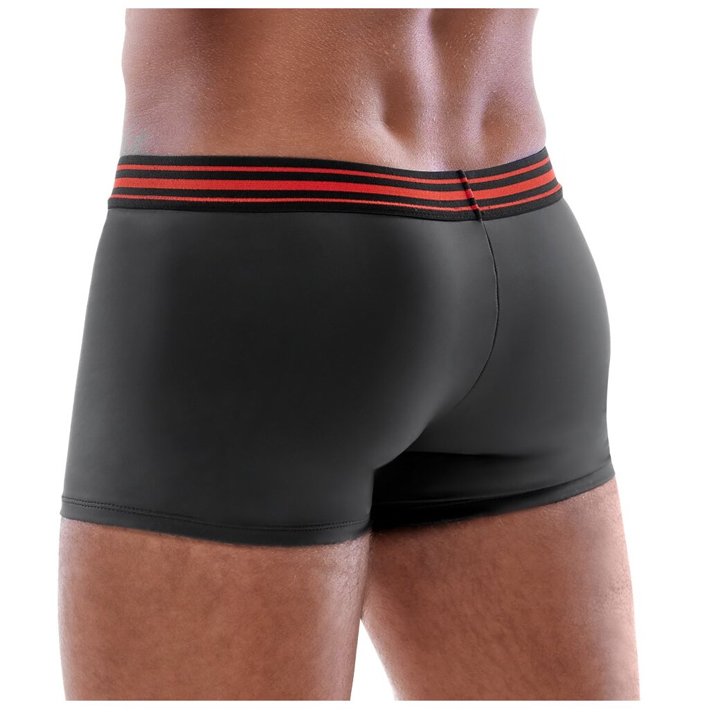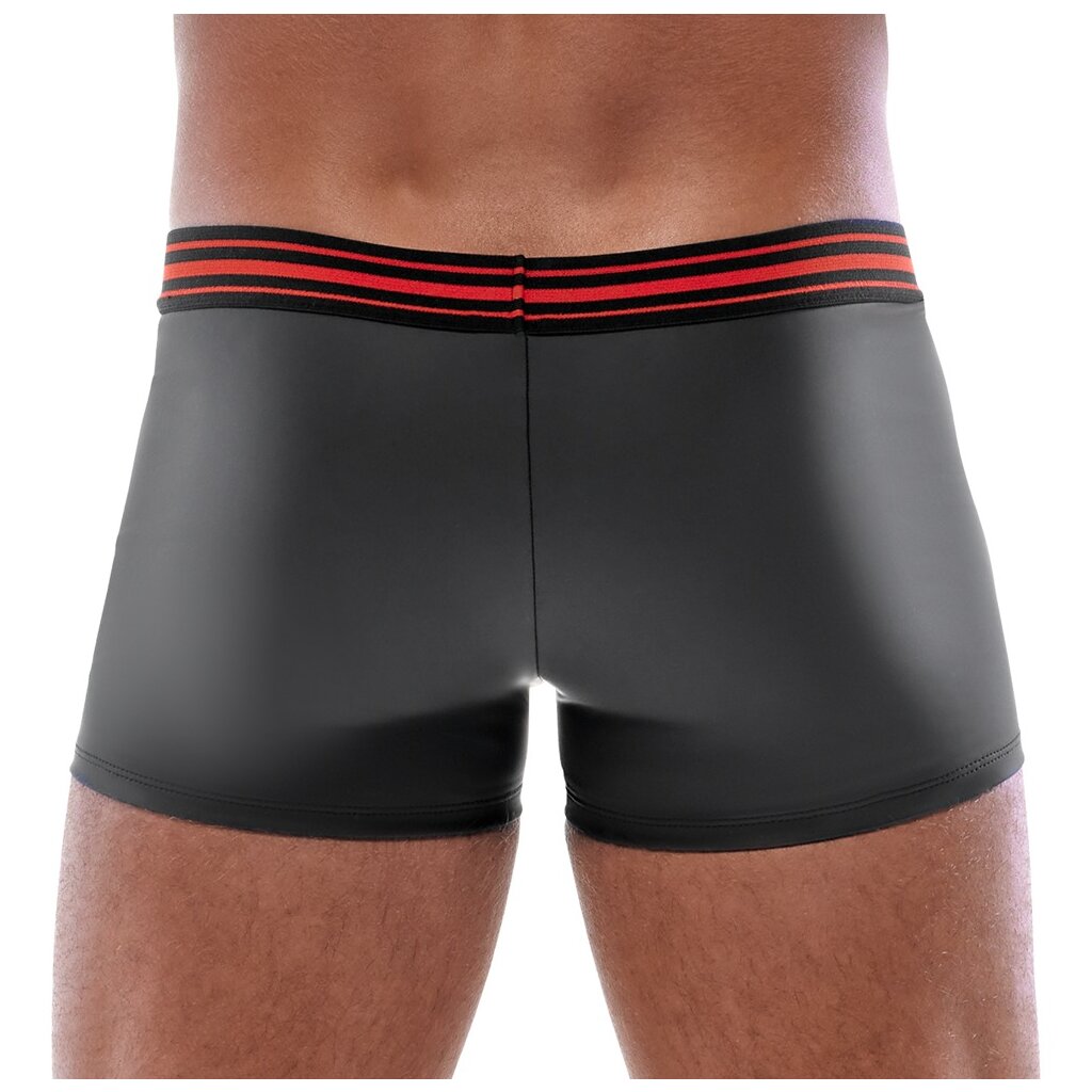 Tight accentuating pants by Svenjoyment in a classy black matt look with eye-catching red, underlaid zip in the pouch and wide striped woven elastic waistband. Soft and elastic all around for maximum wearing comfort. Size L / Material composition: 90% polyester, 10% spandex, polyurethane Coating