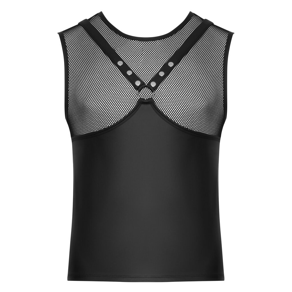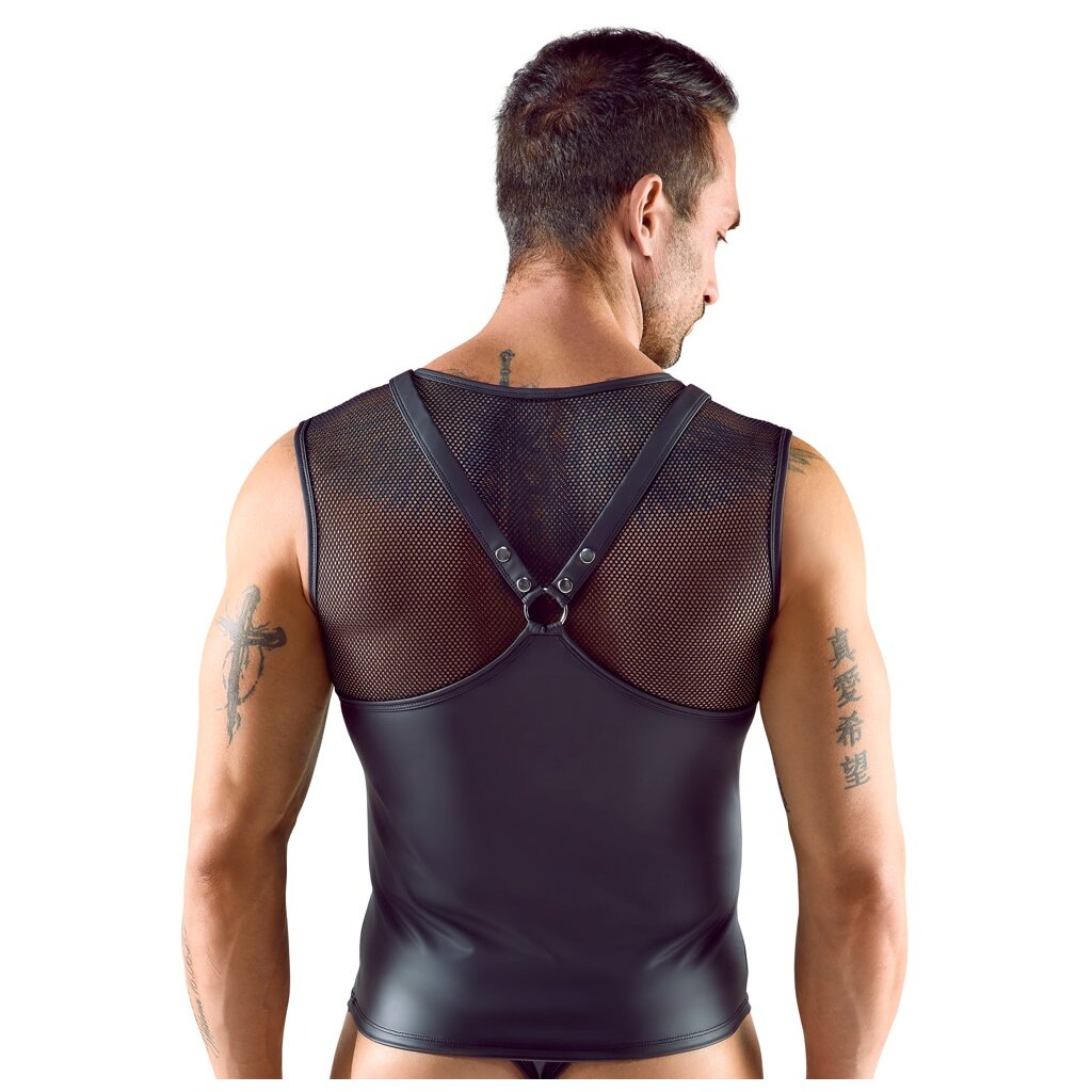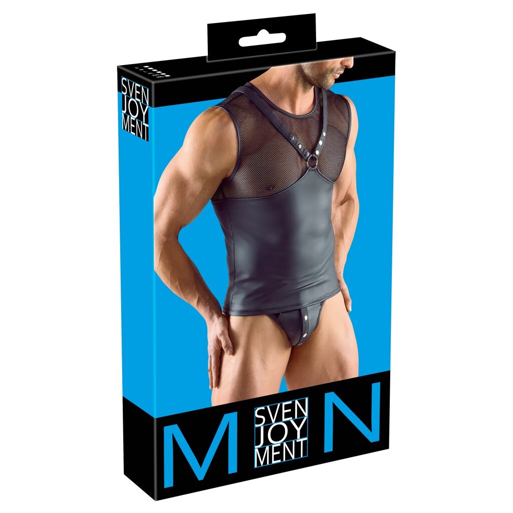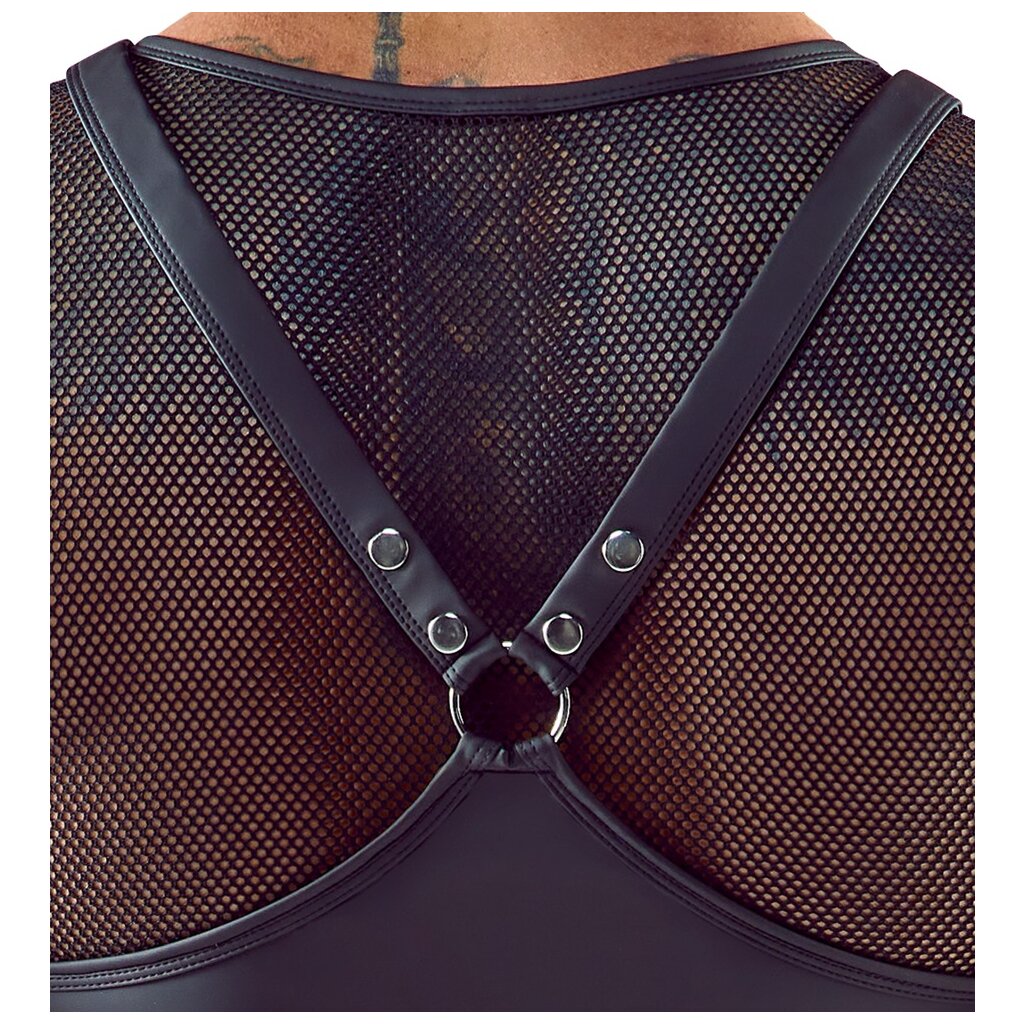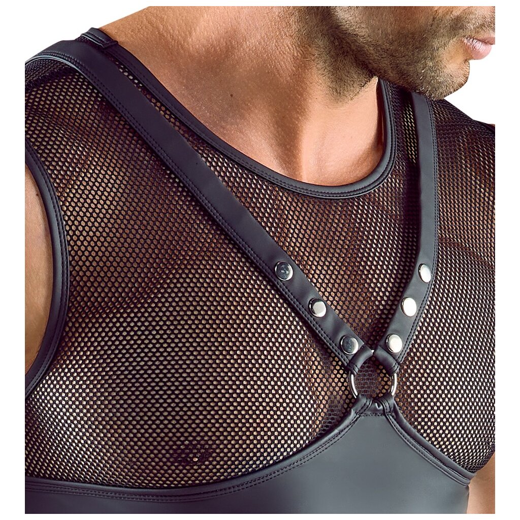 Sleeveless, accentuating shirt by Svenjoyment in a chest harness style with rivets and rings. Black elastic material mix with a high level of comfort: stylish matte look and coarse mesh.